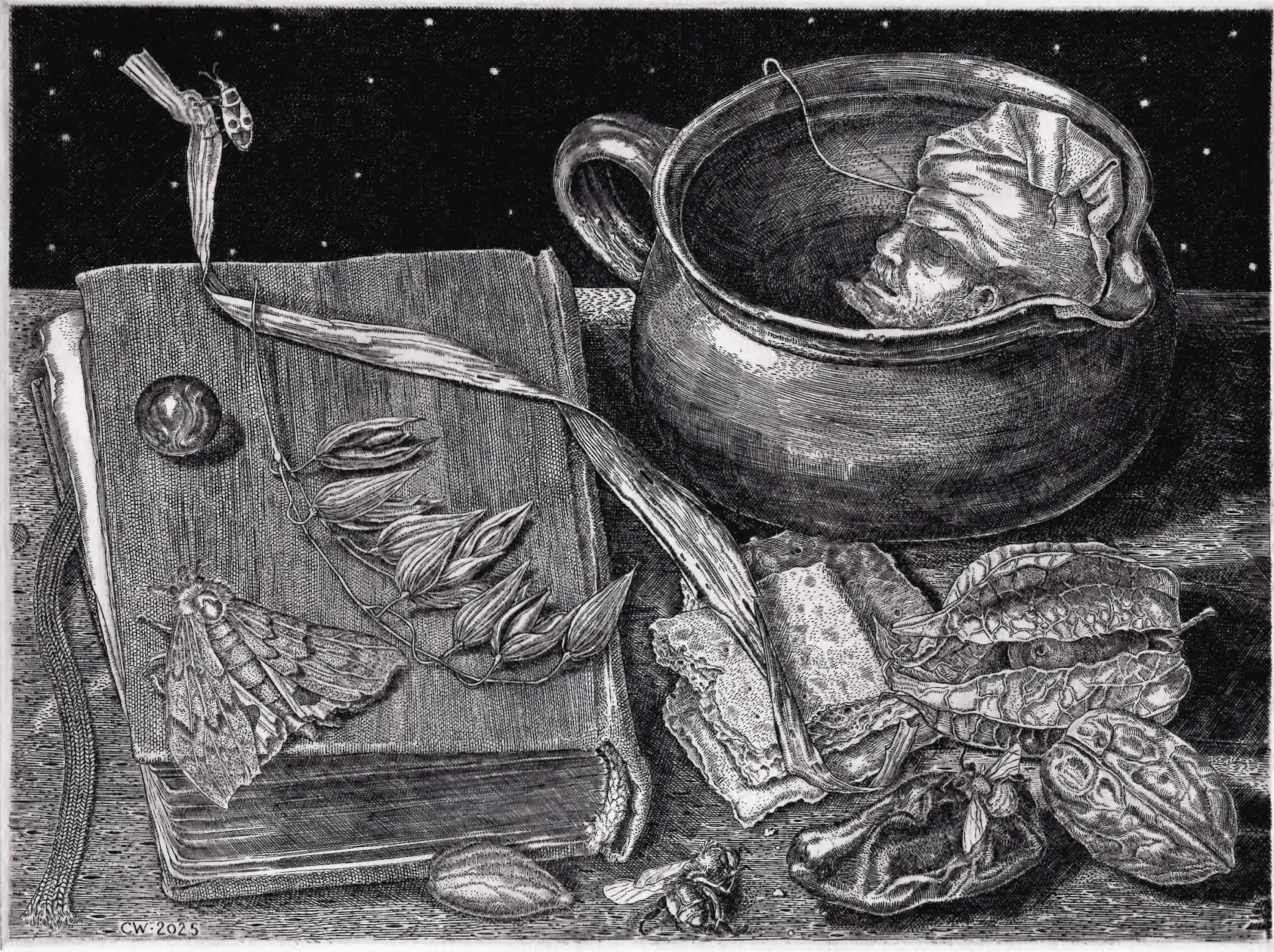 Das Antlitz des armen Poeten in der Teekanne ist ein hintergründiges Zitat von Carl Spitzwegs Dachkammer und zeigt einen Moment der Entrückung angesichts des zu Ende gelesenen Buchs, dem trockenen Keks und dem geleerten Kännchen.