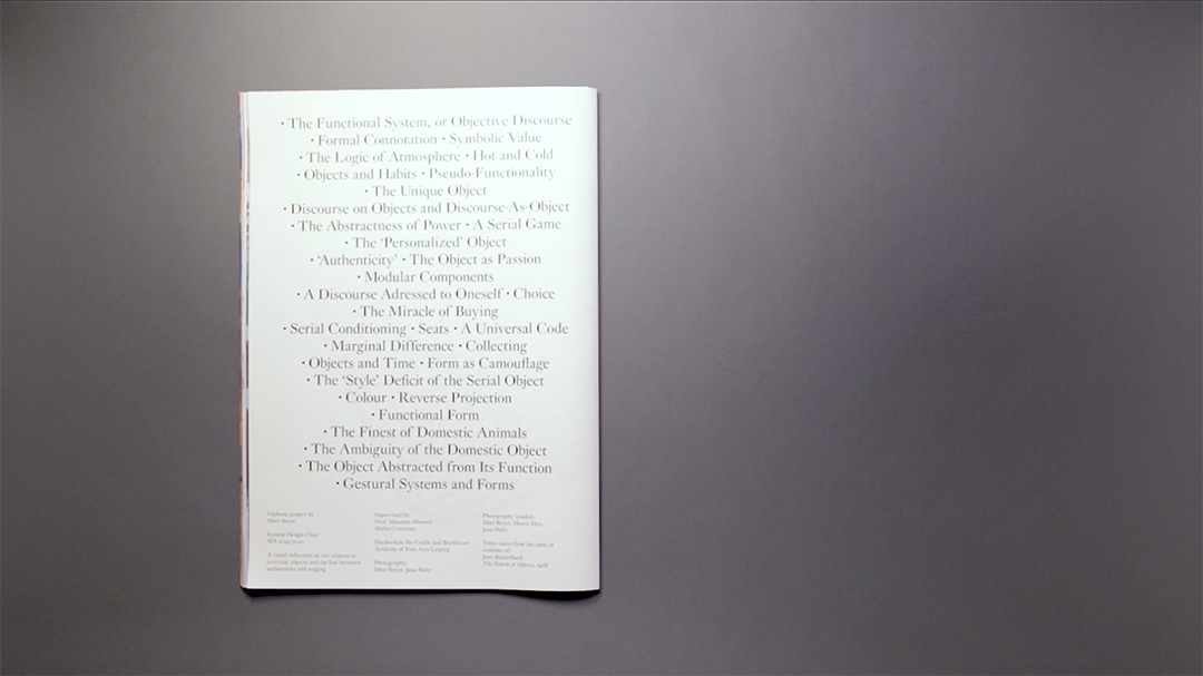 Die Arbeit „A System of Objects“ thematisiert die Beziehung des Menschen zu den ihn umgebenden Alltagsgegenständen im Spannungsfeld zwischen Authentizität und Inszenierung. Bei der Betrachtung eines Wohnraums vermittelt das Zusammenspiel der darin enthaltenen Objekte einen Gesamteindruck und verweist auf die dort lebende Person. In der vorliegenden Publikation werden diese Bezüge verhandelt, indem einzelne Gegenstände aus dem System herausgenommen und verändert, dekonstruiert und defunktionalisiert werden. Durch die daraus resultierende Absurdität wird unsere Wahrnehmung der Dinge gestört und es werden Fragen nach Funktionalität, Dekor, Repräsentation und Originalität im Privaten aufgeworfen. Die defunktionalisierten, durch Form und Material aber doch vertraut wirkenden Gegenstände werden zu Stellvertretern für Objekte – durch die fotografische Inszenierung wird ihnen einerseits ein Wert zugesprochen, andererseits eine selbstverständliche Integration in den Alltag unterstellt. Ihr spekulativer Charakter und der ihnen innewohnende Moment der Irritation sind Grundlage der visuellen Abhandlung, die sich durch die großformatige Publikation zieht. Begriffe aus dem Inhaltsverzeichnis von Jean Baudrillards Werk „Das System der Dinge“ – das den Ausgangspunkt für die Auseinandersetzung bildete – begleiten die Bilder und öffnen Raum für weiterreichende Assoziationen.