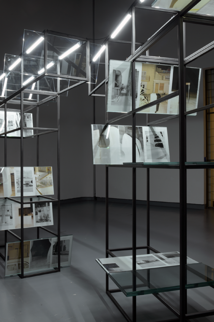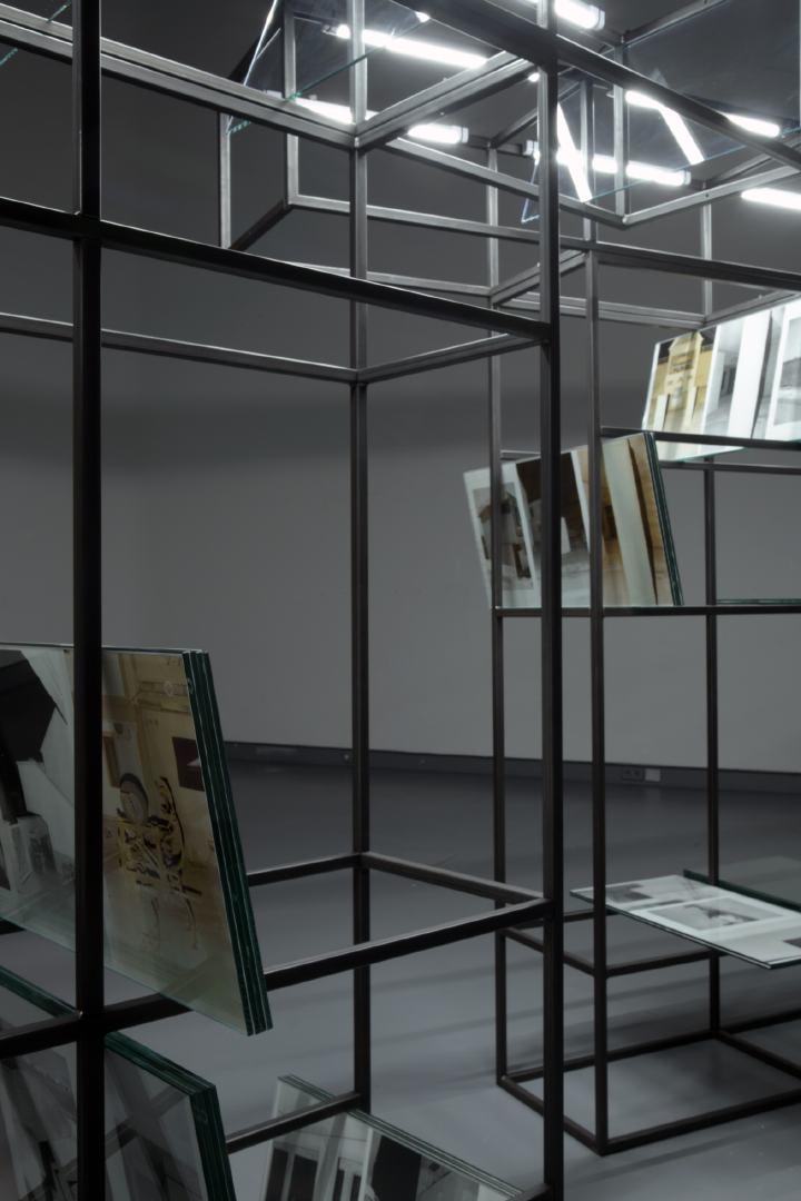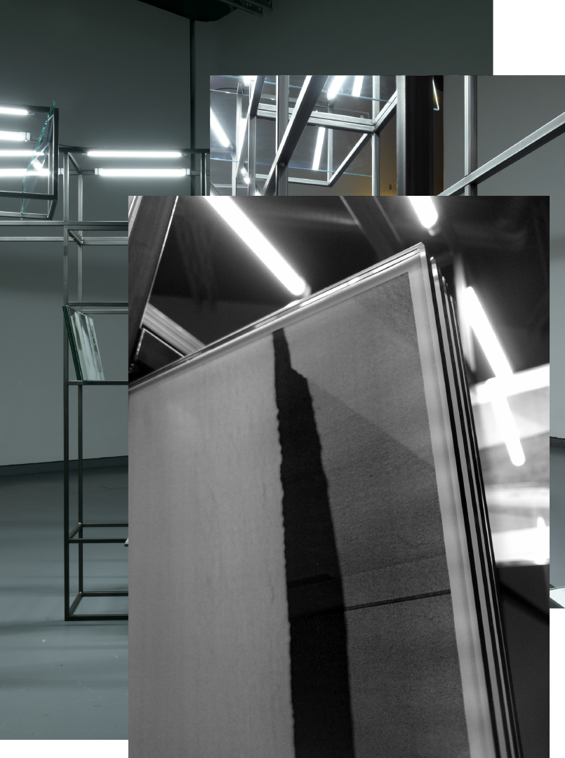 Die Installation »Centro« setzt die Abstraktion der Fotografien mit installativen Mitteln fort. Ein Objekt aus Stahlgerüsten, Fotografien unter Glasplatten und blitzlichtfarbene Lichtleisten bilden den alleinigen Bezugspunkt im Raum. Das Objekt benötigt lediglich den Boden als Standfläche. Die Leere drumherum, die sich im abnehmenden Licht verliert, kontrastiert diese Autonomie mit einer Verlorenheit. Die Geometrie des Gerüsts zitiert die postmoderne Bauweise Gibellina Nuovas. Gleichzeitig scheint das Objekt Ausschnitt einer Bewegung zu sein. Zwei oder mehr Teile driften zu- oder auseinander. Die Betrachtenden sehen den Moment einer Bewegung. Architektur, Fotografie und Installation werden gleichwertig in Beziehung zueinander gesetzt, um Wechselwirkungen zu erzeugen. Beim drumherum- oder auch hindurchlaufen verändert der Körper permanent seine Form. Aus der Nähe betrachtet, tritt der architektonische Eindruck des Körpers zurück und transformiert sich in ein Objekt zu Aufbewahrungszwecken, gefüllt mit Fotografien. Ein Verweis auf Gibellina Nuova als Archiv seiner eigenen, dramatischen Geschichte. Fragile Laserkopien und -drucke befinden sich zwischen Stapeln aus dickem Sicherheitsglas. Den Betrachtenden wird die Möglichkeit des Durchstöberns suggeriert, welche durch die Schwere der Glasplatten jedoch unmöglich ist. Zwischen Statik und Bewegung liegt der Moment. Beim Umkreisen des Objektes setzen sich die Bilder in Beziehung und vereinzeln sich wieder. Die Anordnung der Fotografien als Tryptiche schafft eher lose Gruppierungen, denn feste Verbindungen.
