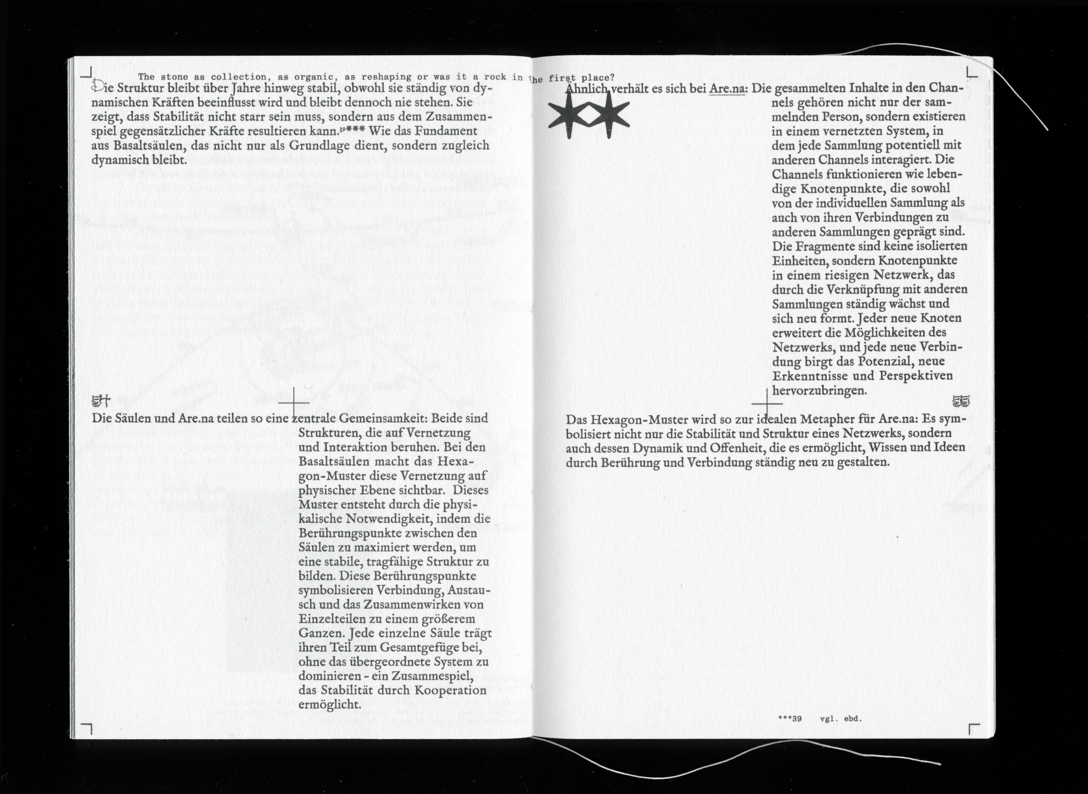 Diese Arbeit versteht das Sammeln als eine Methode des Wiederverbindens: von Zitaten, Bildern, Stimmen, die im Moment des Gestaltens neu zueinander in Beziehung treten. Was zusammengetragen wird, bleibt durchlässig — es geht weniger um Ordnung als um Resonanz. Gestaltung wird zum Fadenziehen durch ein Netz aus Fragmenten; Typografie zum Raum, in dem diese Verbindungen sichtbar schwingen dürfen.