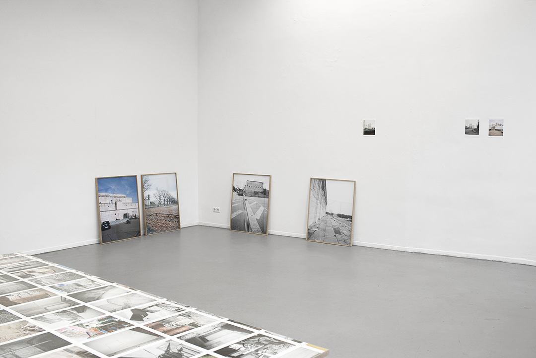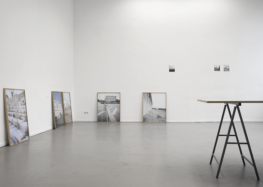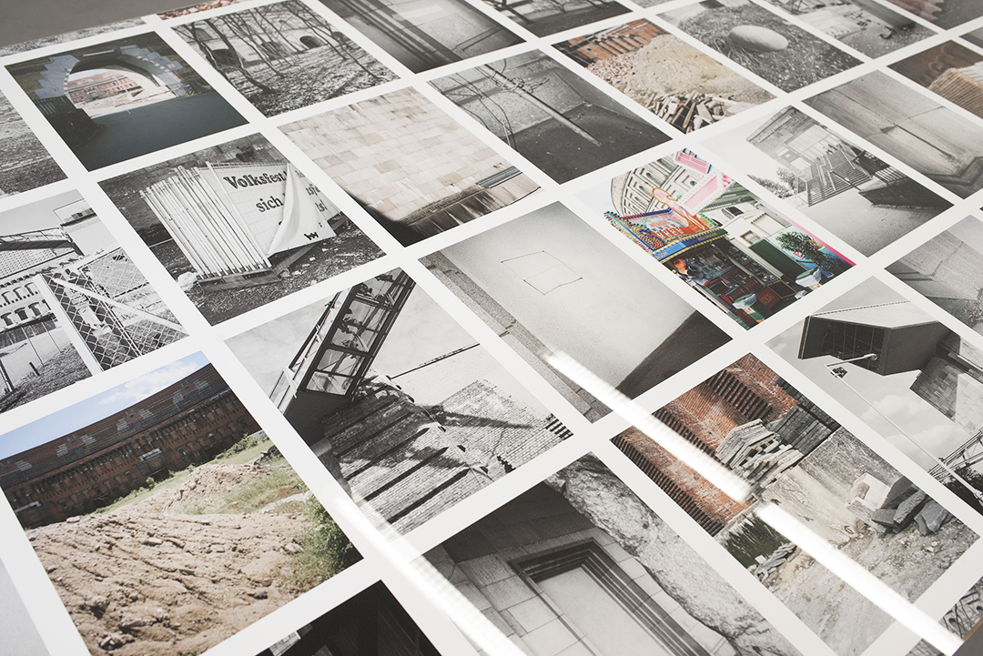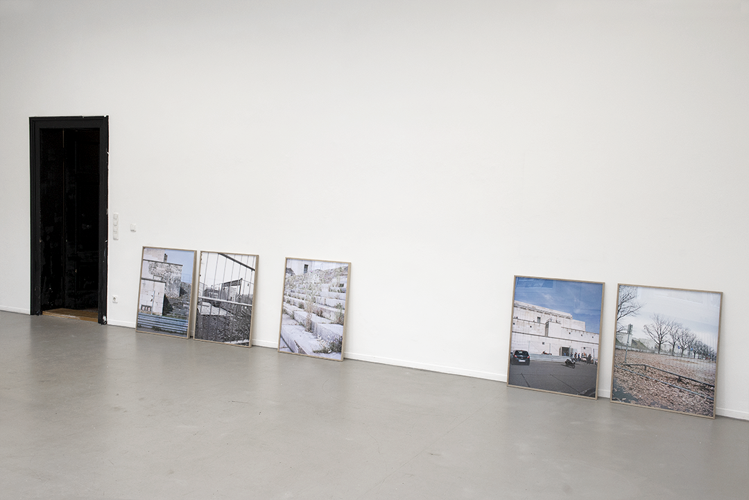 Das Fotografieren vor Ort begriff ich dabei nicht als reines Abbilden, sondern als entschiedene Intervention mit der Kamera, die bewusst gegen den faschistischen Größenwahn vorgeht. Anhand stürzender Linien der perspektivischen Verzerrung und leichten Kippmomenten, gerät die Architektur der Zeppelintribüne ins Stolpern. Der Fokus aufs Detail dekonstruiert den Überwältigungsimperativ der Kongresshalle. Die Verwendung sowohl von Schwarzweiß und Farbe, als auch die Darstellung eines Motivs aus mehreren Blickwinkeln hinterfragen den dokumentarischen Evidenzanspruch in der Konstruktion von Raum. Im Rahmen auf den Boden lediglich an der Wand gelehnt oder als Bogen auf den Tischdisplay verschieben sich die Machtrelationen der Proportionen und das Fassadenhafte der faschistischen Architektur wird ersichtlich.