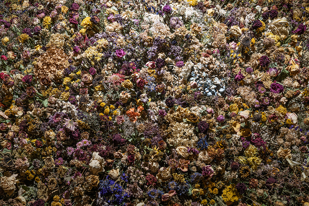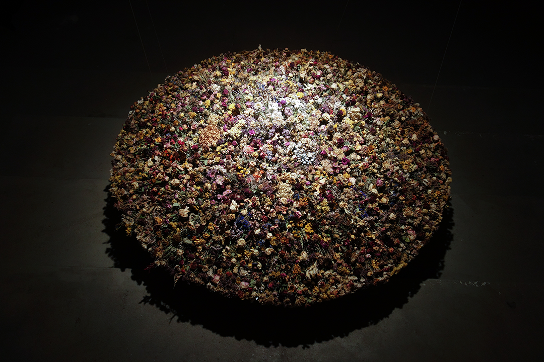 Eines Tages habe ich in einem Buch den schönen Satz gelesen: „Ein Friedhof ist eine wie aus der Zeit genommene Landschaft“. Ein Friedhof ist ruhig und schön. Aber der schönste Ort innerhalb des Friedhofs ist dort, wo gerade eine Beerdigung stattgefunden hat. Da, wo frische, bunte, schöne Blumen geschmückt sind. Die Situation, dass Leben und Tod an einem Ort zugleich sind, ist für mich ambivalent und daher interessant. Aber, was mich noch stärker beeindruckt hat, waren die verwelkten Blumen im Kompost-Müll. Das war ein Moment, in dem ein Wesen existiert und zugleich vergeht. Seit zwei Jahren sammel und trockne ich die Blumen. In dieser Arbeit stecken Zeit und Erinnerungen von zwei Jahren.