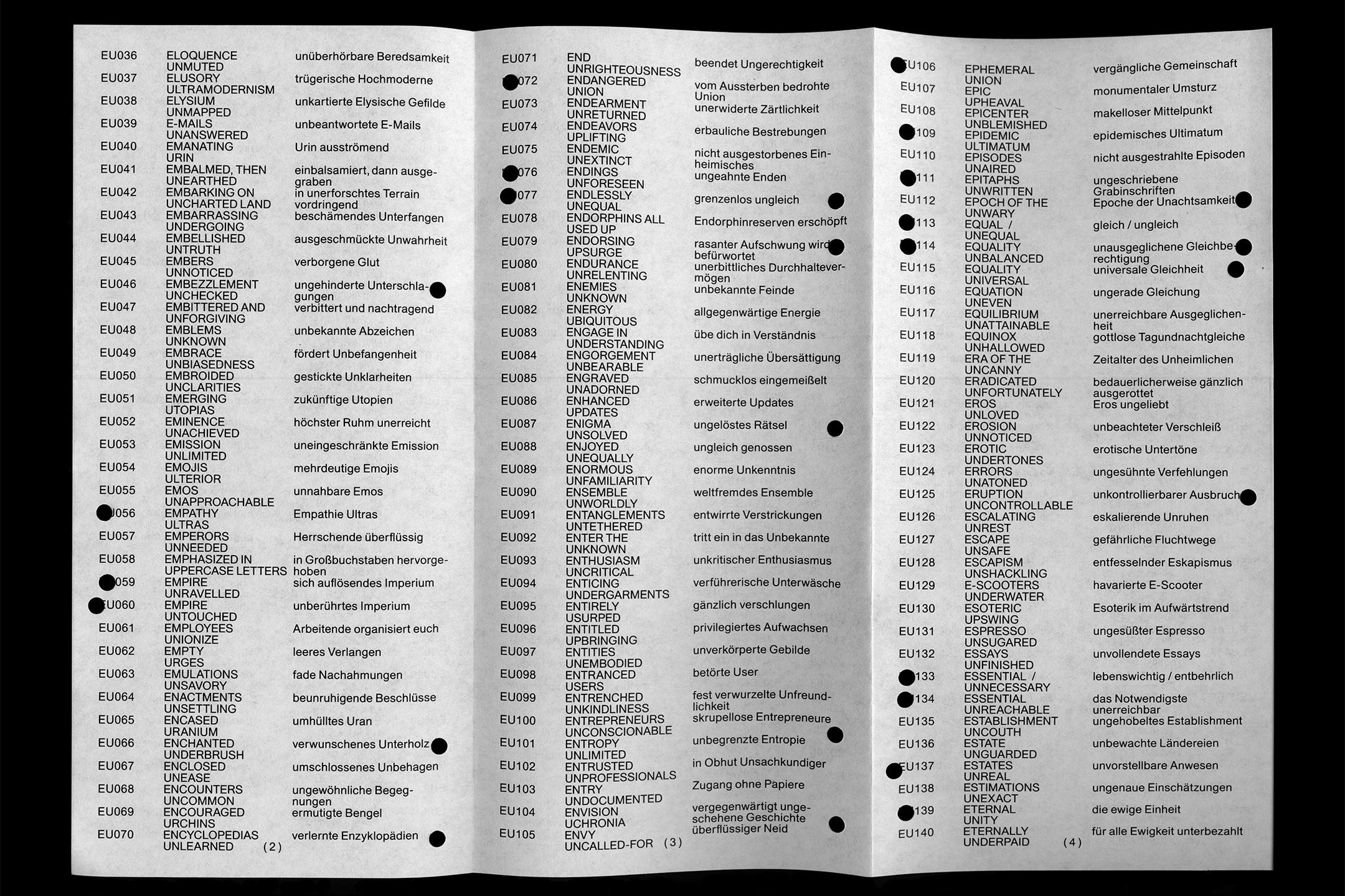 The acronym “EU” unites infinite experiences, demises, conflicts and desires. Different positions induce to look into ones own identity and representation.