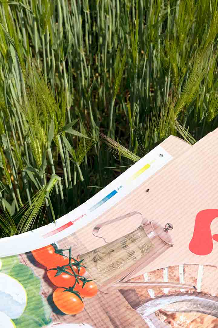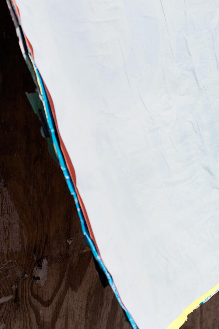 Pizza gibt es wirklich überall. Als ich die Pizza-Box in das Feld legte, empfand ich es nicht als Störfaktor. Vielleicht liegt es an der Monokultur, oder an der Farbigkeit. Oder an beidem. Die Materialität genau zu betrachten, um zum Beispiel Rückschlüsse auf Produktionsprozesse zu erhalten, wie zum Beispiel durch die Abbildung und die Funktion des RGB Farbkonstrollsreifens, der sich auf der gegenüberliegenden Seite auf dem Bild Tryptich View, B wiederholt. Dieser hat sich jedoch durch die Überlappung von übereinander gekleisterten Werbeplakaten erstellt.