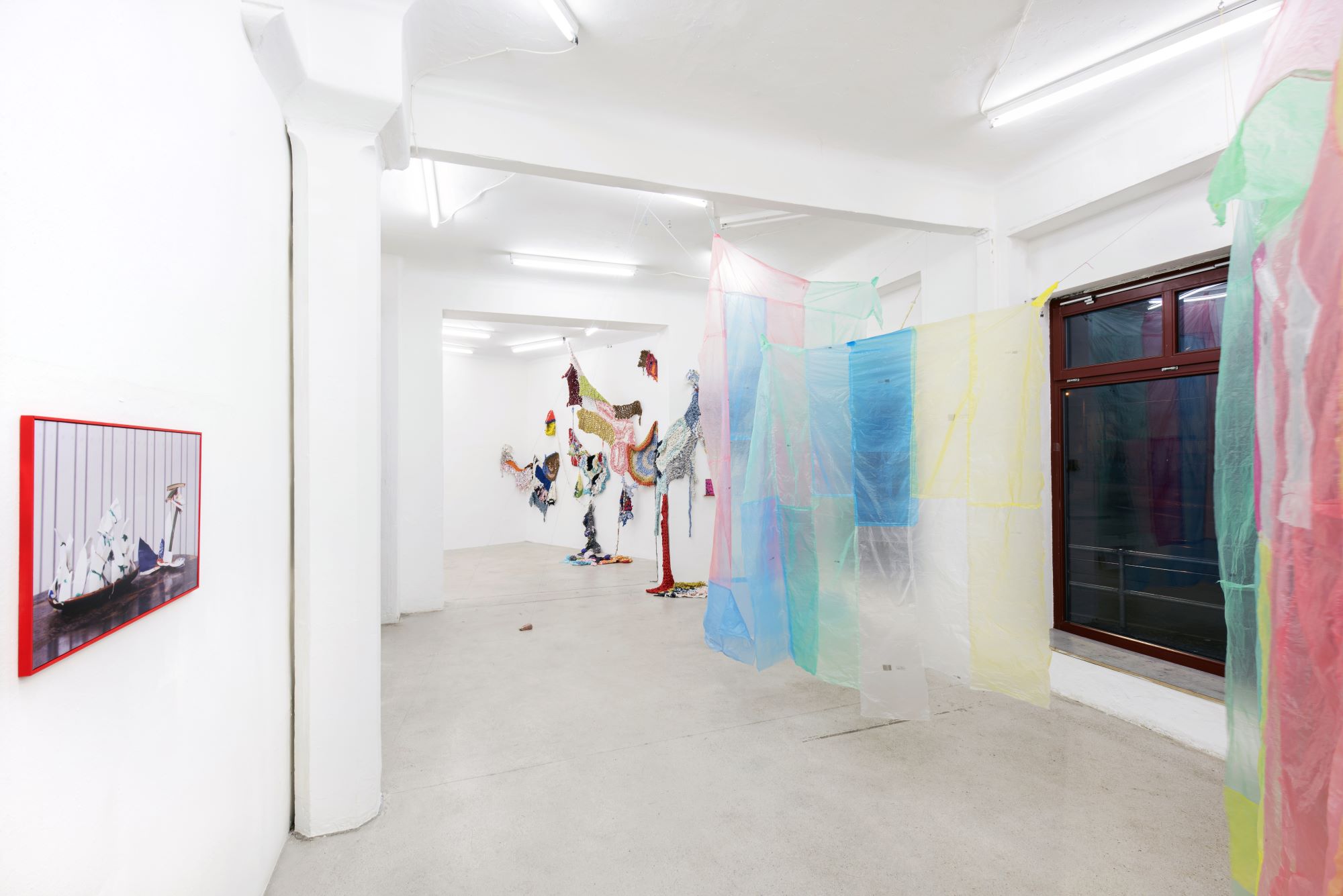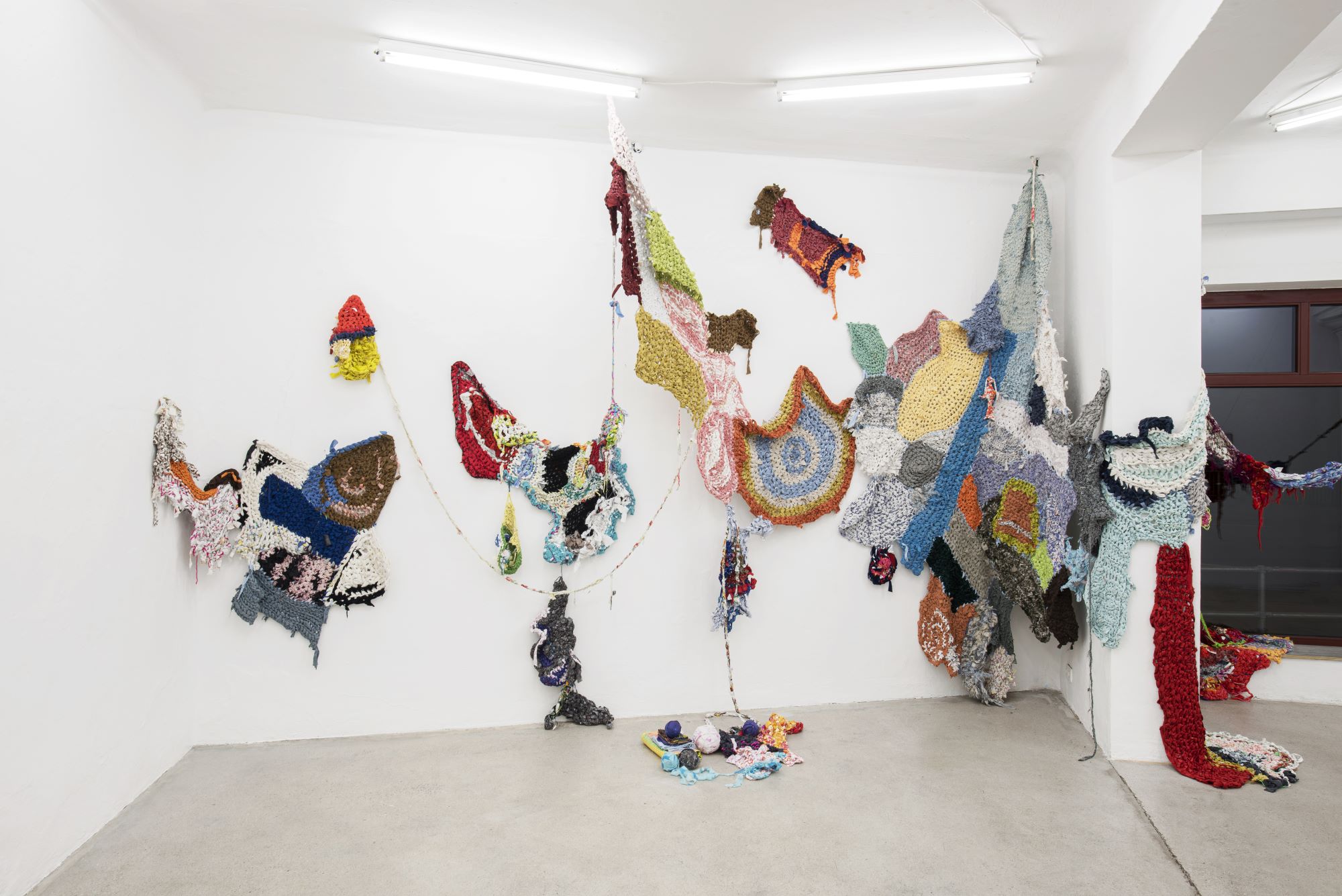 Raumansicht II, Werke v.L.n.R.: Luftschloss I-V 2024, Etna Wucherung, Textil fortlaufend seit 2020 Im Westen wird sie untergehn, 2022