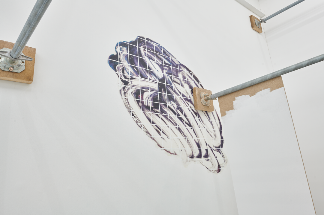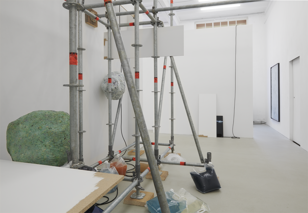 Intertwined Conditions / Installation mit 5 Clustern aus verdichteten Bildfragmenten, 17 Wasserbehältnissen mit extrahierten Druckertinten von Bilderzeugnissen, 1 hybriden Transferdruck auf Wand, 4 Videoclips mit Sound, 5 Sauerstoffschläuchen, 5 Spanplatten mit Wandfarbe, 75 Gerüstmodulen / Dimension variabel / 2020