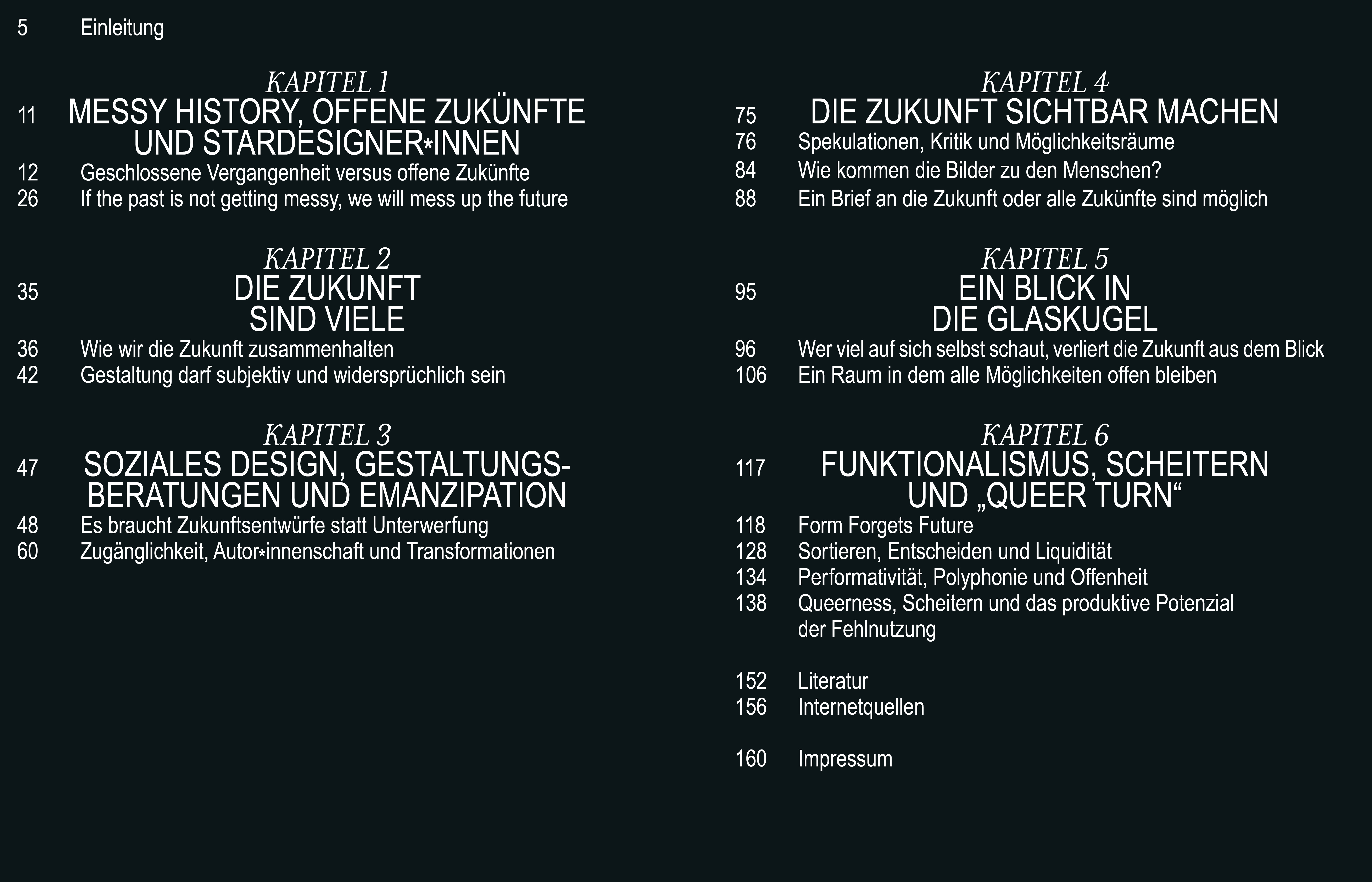Die Metapher des Katalogs, als auch die Pluralform des Titels weisen auf eine Polyphonie hin. So konzipiert das Buch einen Möglichkeitsraum, der viele verschiedene mögliche Zukünfte diskutiert, verhandelt und vereint. Dazu werden sechs verschiedene Themenbereiche besprochen. Jedes Kapitel befragt auch die Gestaltung editorisch auf einen jeweiligen Aspekt der Zukunftsproduktion.