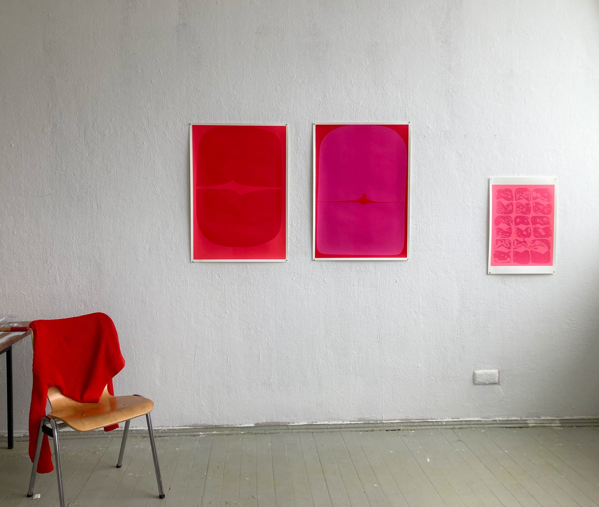 „Life in Red“ ist eine künstlerische Erkundung des Rotspektrums, die von Farb-Interaktion und Farbfeldmalerei inspiriert ist. Im Sinne von Josef Albers oder Rupprecht Geiger spielt „Life in Red“ mit warmen und kühlen Rottönen und bringt die Wechselwirkung von Farbe im Bereich des Monochromen zur Erscheinung. Rot kann als blasses Rosa zart und originär oder als Karmin-Rot herausfordernd wirken und hat scheinbar so viele Facetten wie keine andere Farbe. Es entstehen subtile Spannungen, die sich nicht in komplementären Farb-Gegensätzen, sondern in feinen Ton-in-Ton-Nuancen geltend machen. In dieser rosaroten Welt entspinnt sich ein Farb-Dialog, der zwischen Zusammenklang und subtiler Dissonanz oszilliert. Formelemente lassen sich aus der ungegenständlichen Malerei schwer wegdenken. Selbst die monochrome Malerei verzichtet selten ganz auf Formelemente. Die Bildgrenze des monochromen Bildes ist oft zugleich Formgeberin. ‚Life in Red‘ thematisieren durch einfache Formen das Changieren zwischen Passung und Nicht-Passung und greift damit das Ambivalenz-Geschehen der farblichen Interaktionen auf.