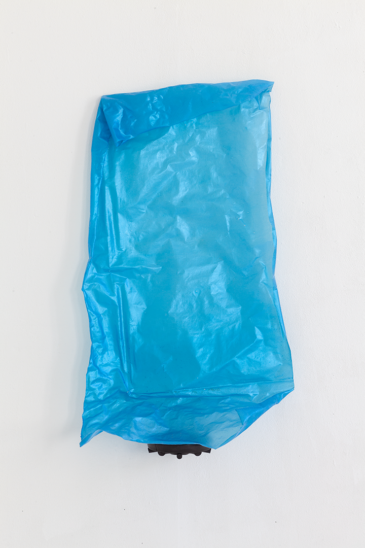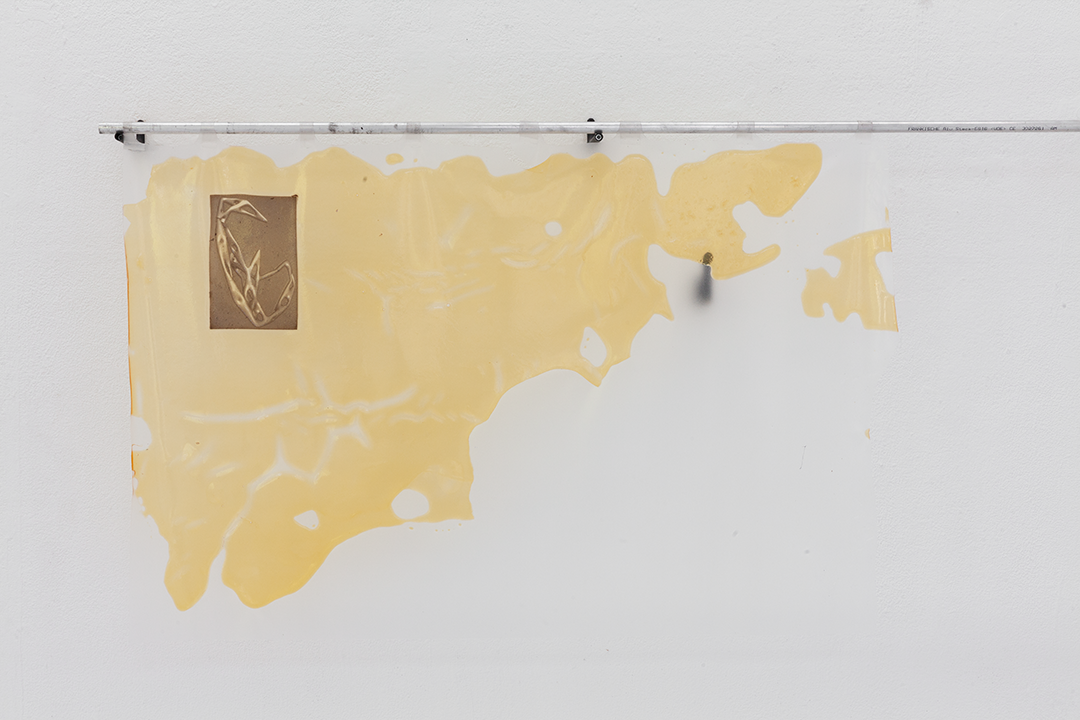 Ohne Titel, 2020, getrocknetes Agar Gelee, Pigment, Insektenschutznetz, Gips