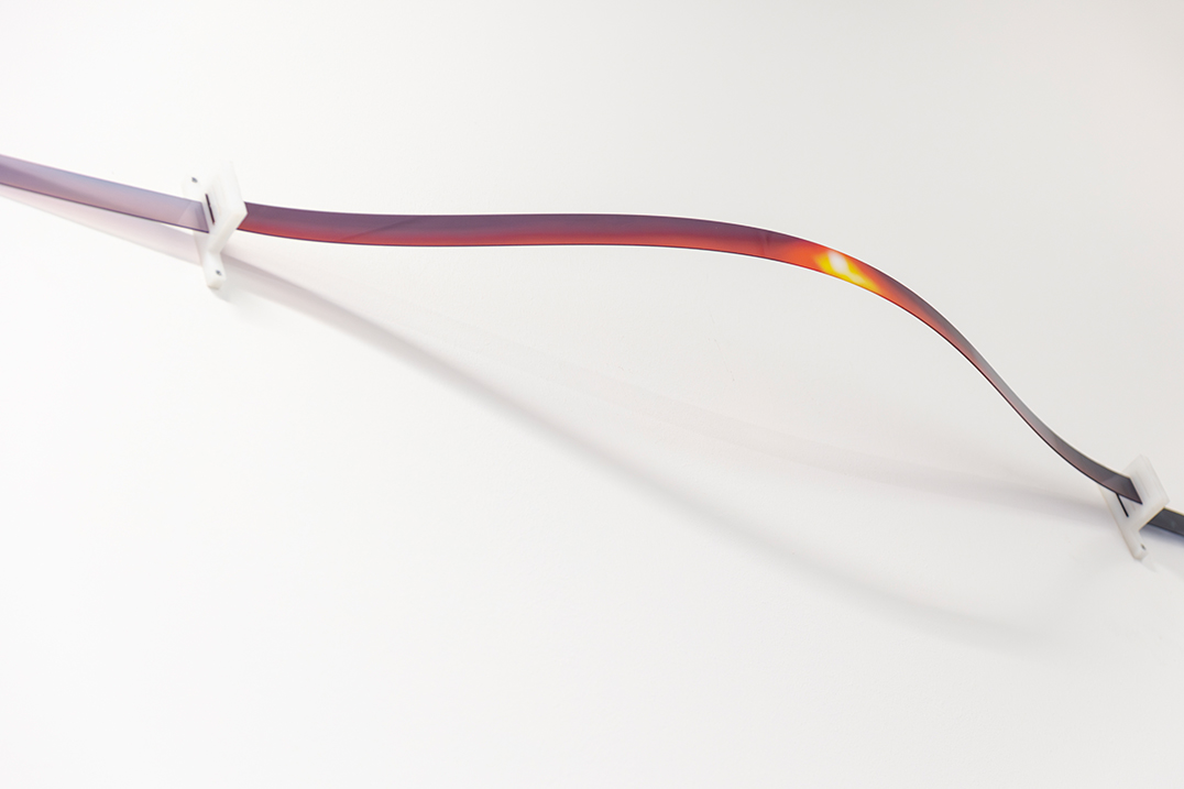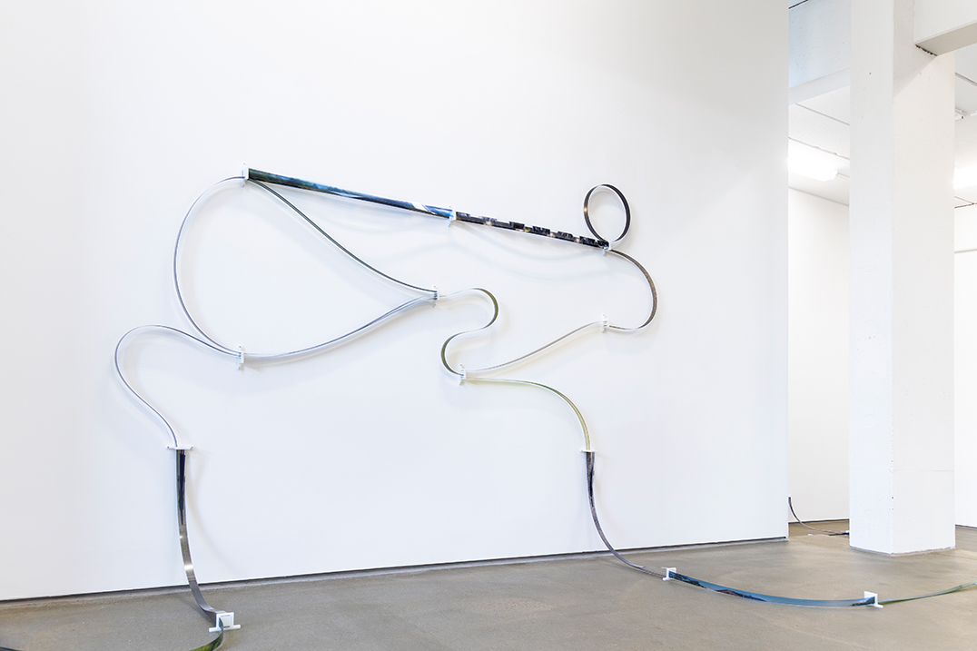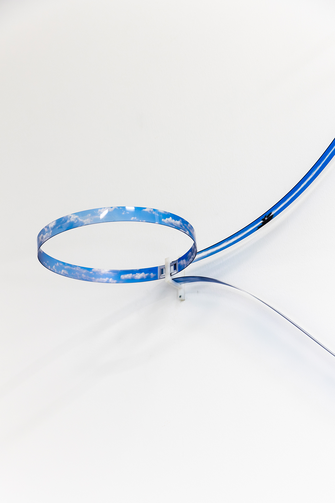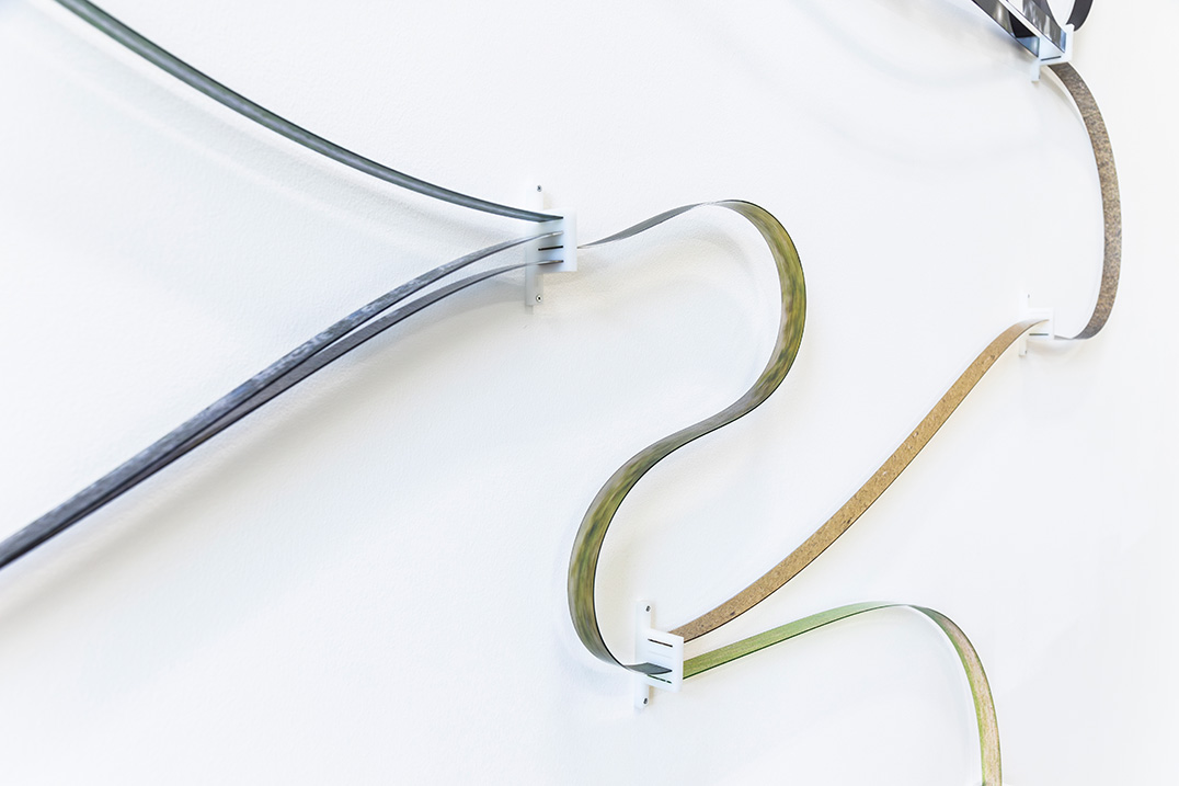 Maps, Slides, Loopings setzt sich aus einem wachsenden Inventar auf Acrylglas gedruckter Bildelemente zusammen, die variabel durch Kunststoffhalterungen miteinander verbunden und im Raum angeordnet werden können. Die jeweils 1 Meter langen, transparenten Streifen zeigen verschwommene Fragmente von Landschaften, Böden und Wetter. Sie stehen modellartig für die Blicke, Umgebungen und Strecken potenzieller Lebensrealitäten ein und ergeben lose Erzählungen, die sich an unbestimmten Orten abspielen. Eine Aneinanderreihung möglicher Perspektiven auf eine sich ständig scheinbar wahllos austauschende Umgebung.