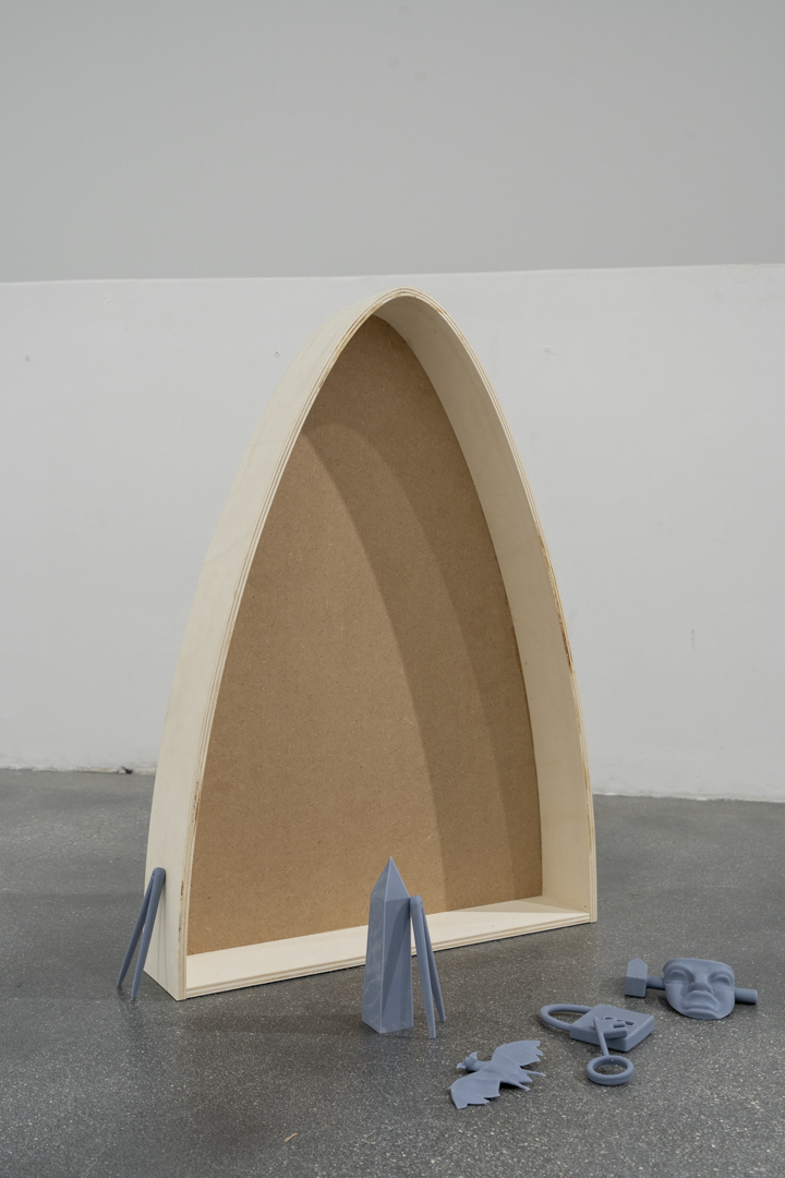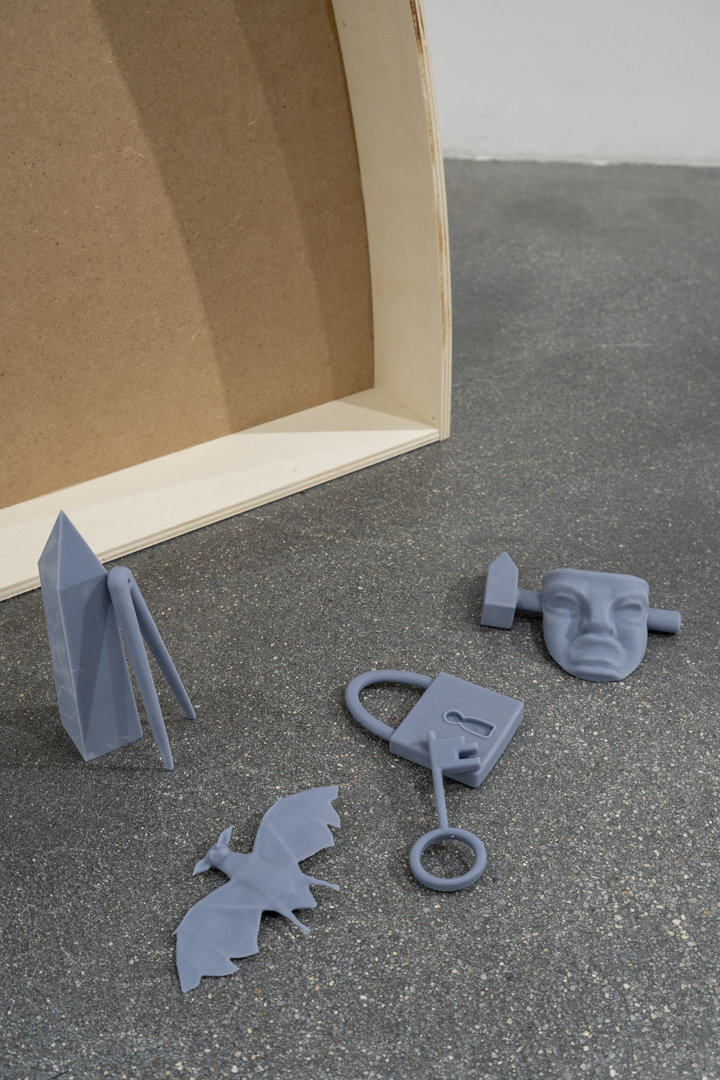 In der Diplomausstellung „My Room of pictures - Mein Raum der Bilder“ finden wir eine Ansammlung von dreidimensionalen Objekten, die aus Holz und Kunststoff gefertigt wurden. Formell bewegen sich diese im Feld von historistischen Formen und Symbolen, die mit Hilfe von Handwerks- und Konstruktionstechniken materialisiert wurden. Die aus Architektur- und Designgeschichte bekannten Formen, wie der Obelisk oder der gotische Bogen werden künstlerisch mit der Frage von Oberflächlichkeit und Künstlichkeit in Verbindung gebracht. Spätestens mit dem Wissen, dass alle Objekte ursprünglich Fotografien entstammen, die mithilfe der eigenen räumlichen Vorstellung des Künstlers in den physischen Raum übersetzt wurden, wird klar, dass hier mit der Wahrnehmung von Realität und Fiktion gespielt wird. Durch die bühnenhafte Anordnung im Raum und dem Spiel mit Größenverhältnissen wird eine Situation wie in einem surrealen Kammerspiel suggeriert, das die eigene Wahrnehmung bis ins Unbewusste herausfordert.