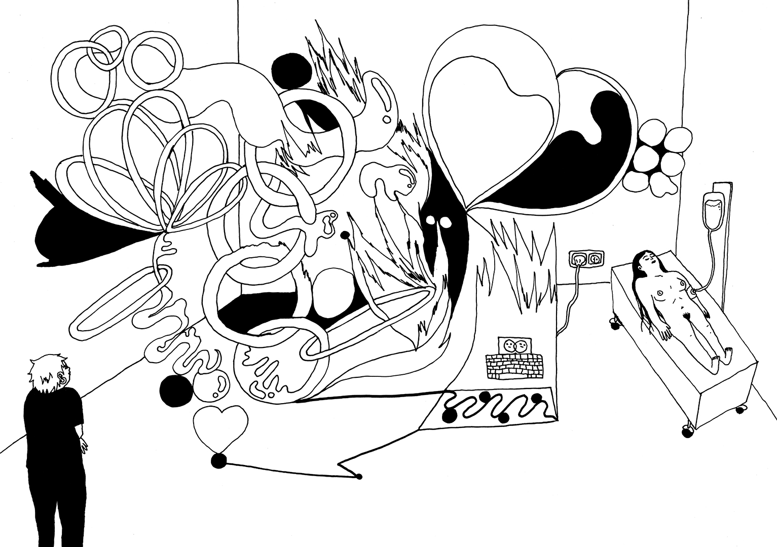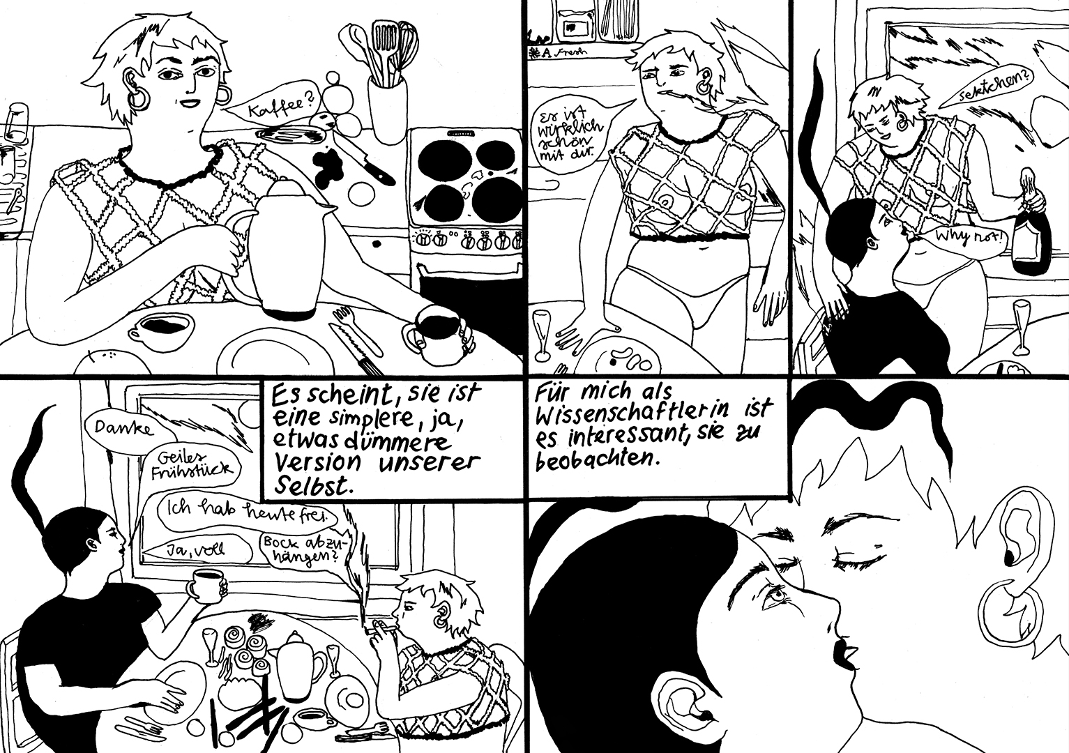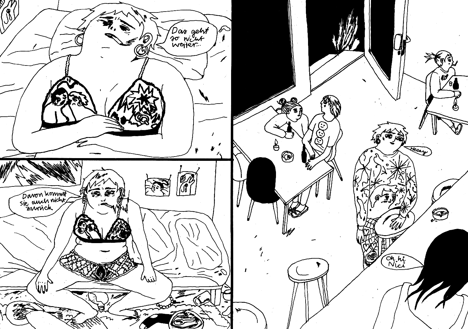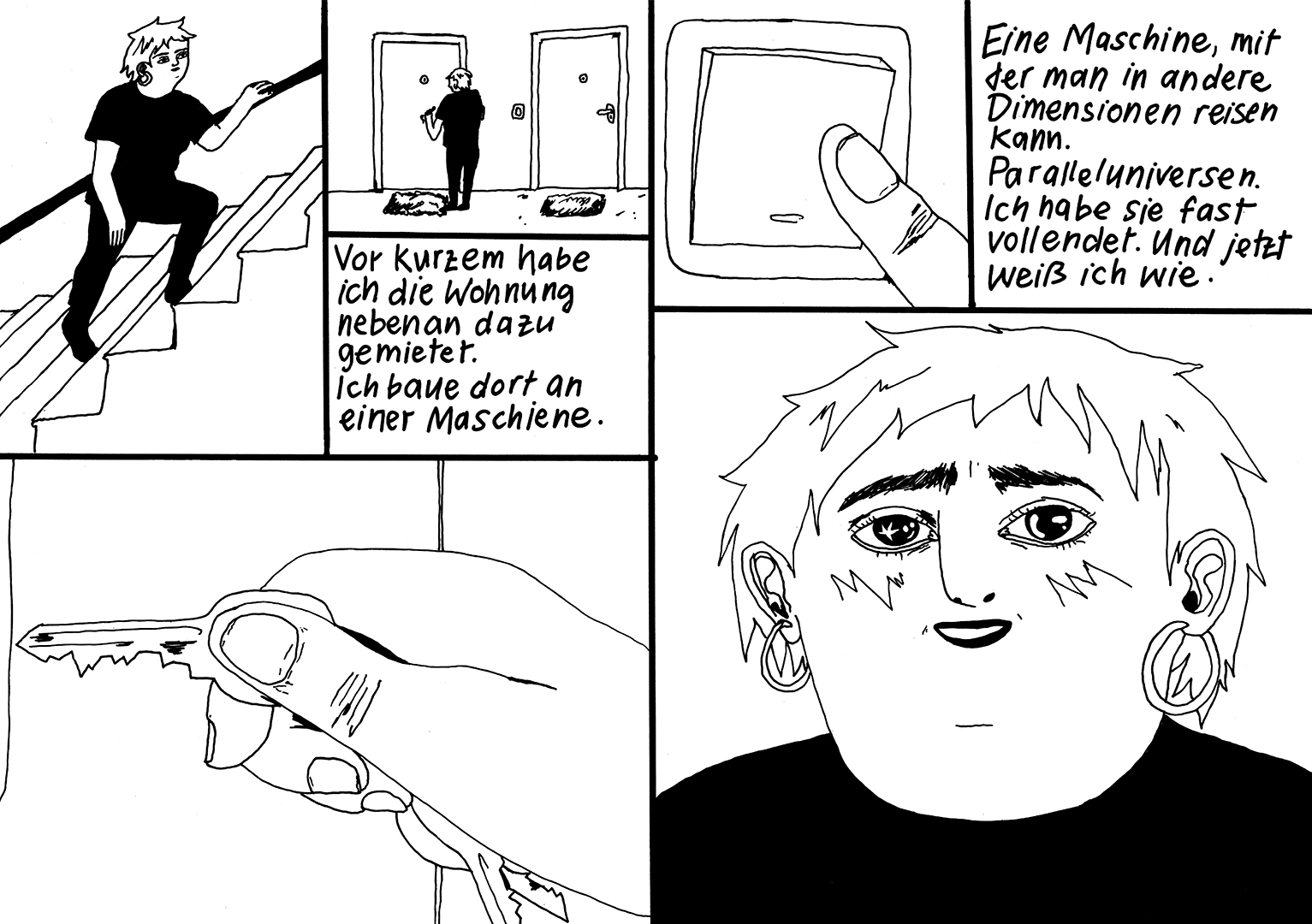 Die Arbeit umfasst einen Comic und Textilen. Die Textilien sind im Vorhinein entstanden. Sie sind teils umgestaltete Secondhand Kleidungsstücke und teils komplett selbst genäht. Während der Arbeit an den Textilen habe ich die Geschichte des Comics geschrieben. Die Protagonistin Nici ist Wissenschaftlerin, die eine Maschine baut, mit der man in parallele Dimensionen reisen kann. Sie begibt sich auf diese Reise in einem menschlich aussehendem Puppenkörper, den sie Melek nennt und in den sie ihr Bewusstsein überträgt. In der parallelen Dimension trifft sie auf eine andere Version ihrer Selbst. Diese kennzeichnet sich optisch vor allem durch den anderen Kleidungsstil. Während Nici 1 ausschließlich schwarz trägt, hat Nici 2 einen sehr ausgefallenen Kleidungsstil – sie trägt die Kleidung, die ich vorher gestaltet habe. Außerdem arbeitet sie in einer Bar und ist scheinbar keine Wissenschaftlerin. Die beiden verbringen Zeit miteinander und die Beziehung wird komplizierter. Eine Geschichte über Selbstliebe und -hass, sowie über Identität und Realität. In den Comic ist hauptsächlich in schwarz-weiß gezeichnet und es sind immer, wenn es einen Dimensionswechsel gibt oder eine Situation sich emotional so anfühlt, bunte gemalte Bilder eingefügt.