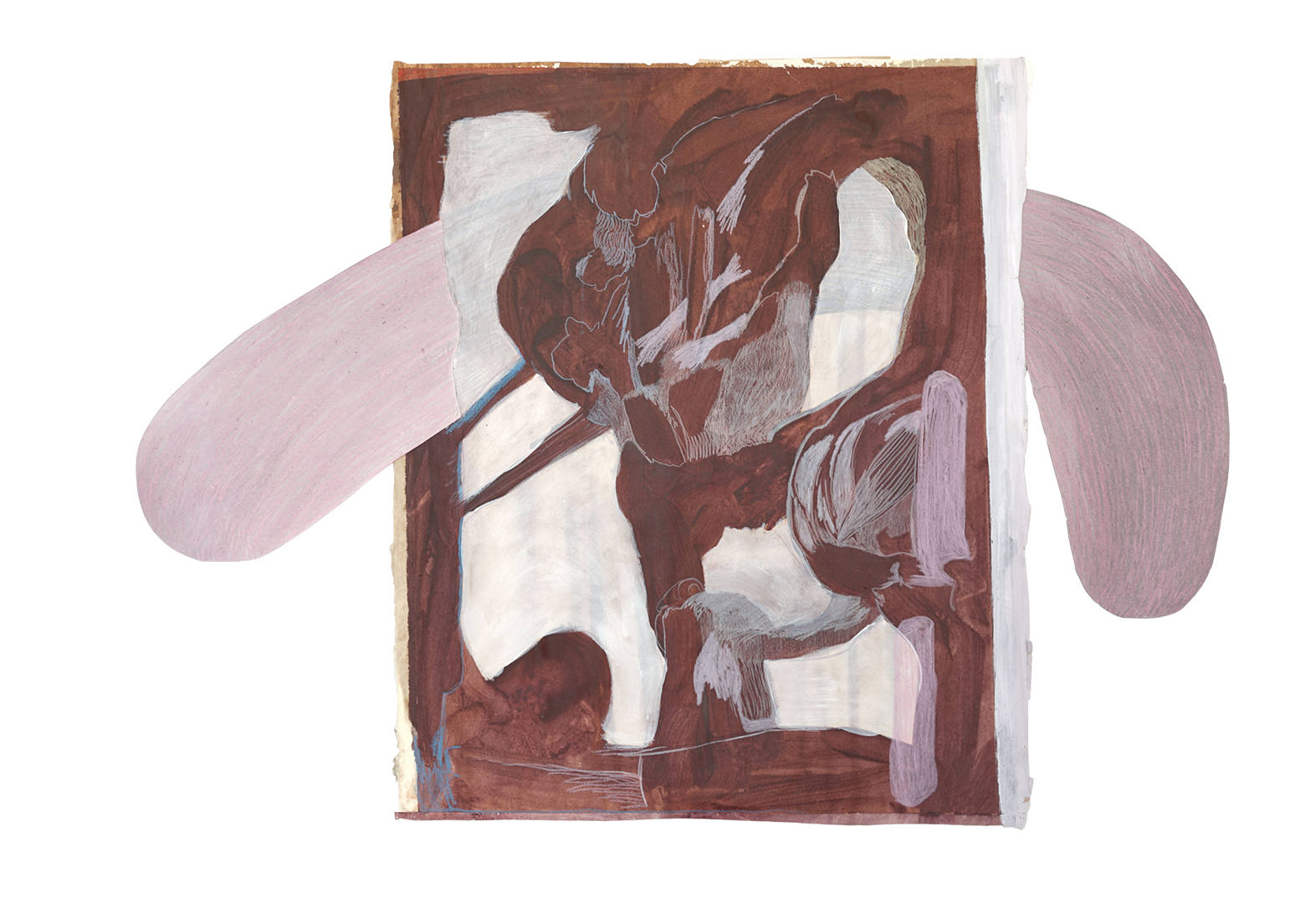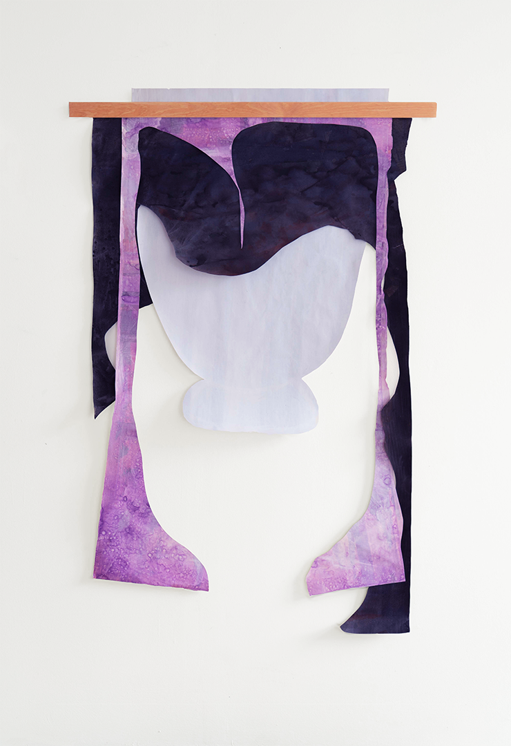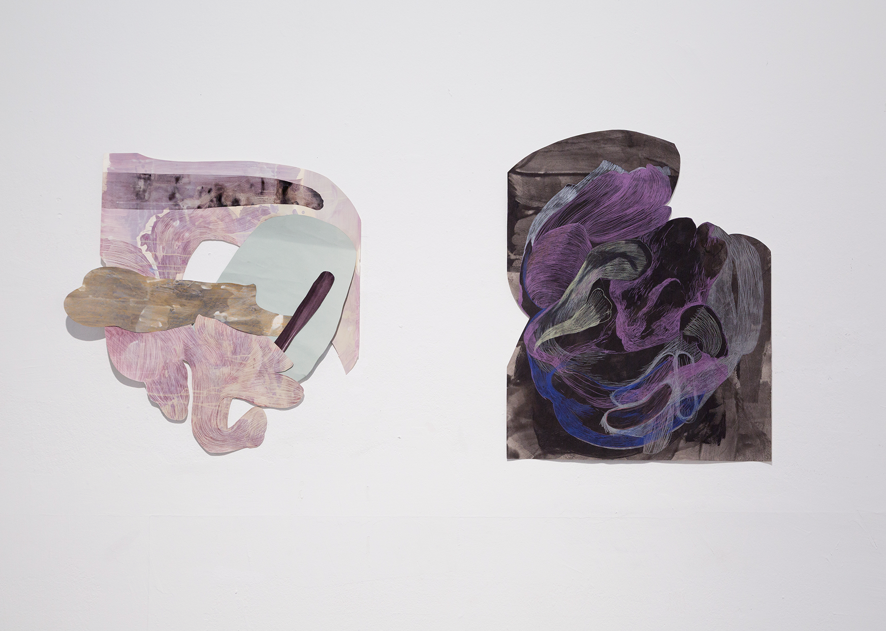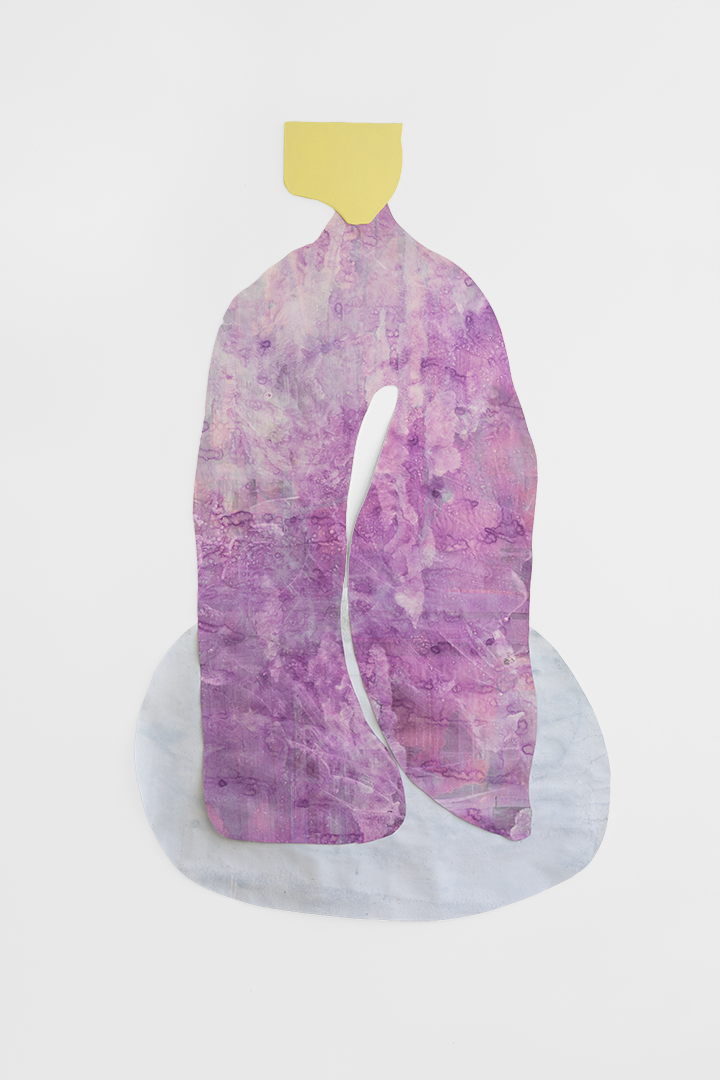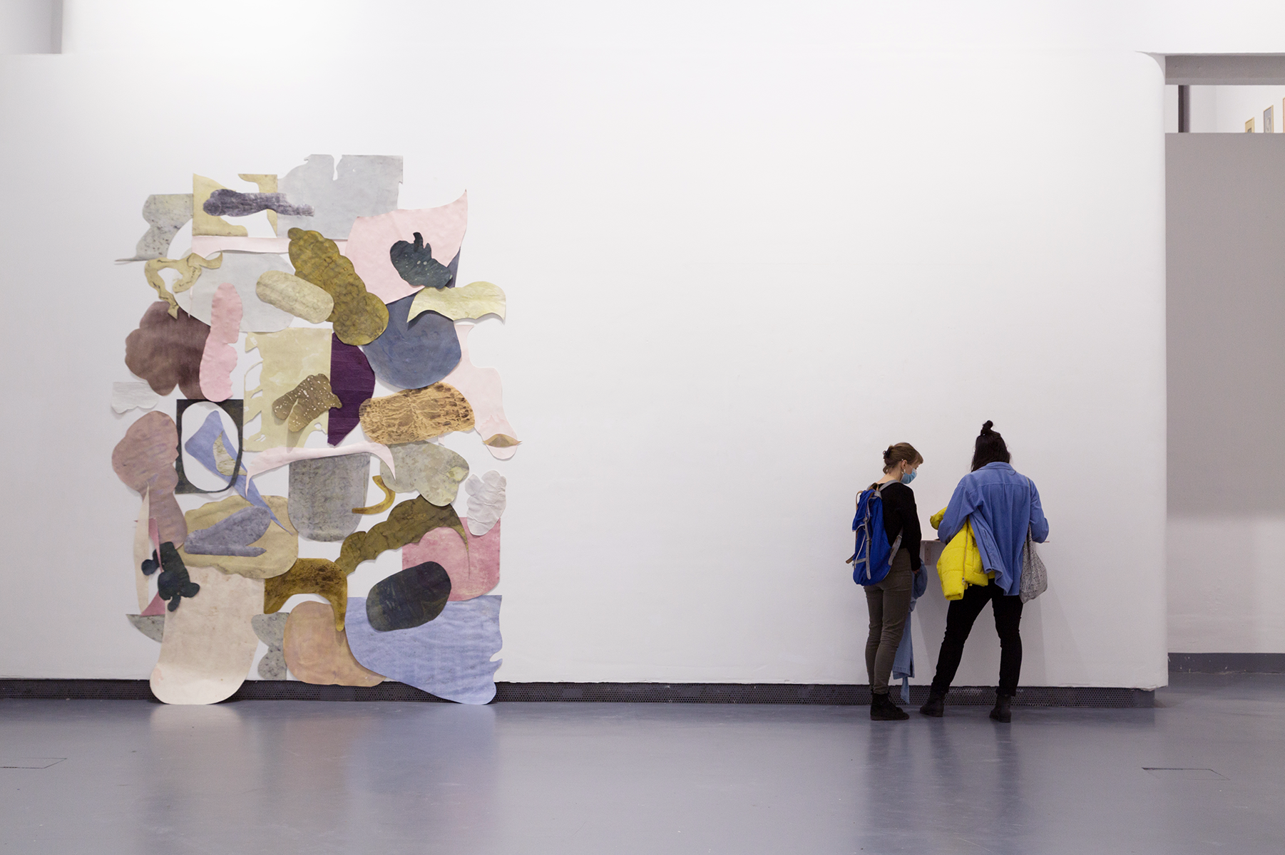 Gefärbtes Papier, überklebt, ausgeschnitten und bezeichnet entwickelt sich zu eigenständigen "Körpern" in Bildwelten. Sie werden zu immer wieder neu verknüpften Volumen und Mustern, die dem Versuch geordnet zu werden entfliehen. Durch die Vermengung ihrer Robustheit, Anpassungsfähigkeit oder ihrer Fragilität befinden sie sich in einer ständigen Metamorphose. Die Diversität der dafür verwendeten Materialien und deren Eigenschaften unterstützt diesen Prozess und gibt ihr die Möglichkeit, Formen, Farben und Bildträger zu einem gemeinsamen organischen Gefüge werden zu lassen, sie 'flattern' , 'schweben' oder 'warten' zu lassen.