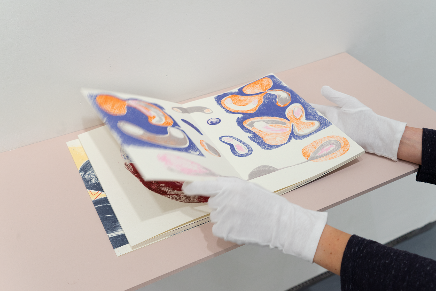 Ausstellungsansicht des handgedruckten Offsetbuches 'Schwebezustand'2020, 29,5 x 21,5cm