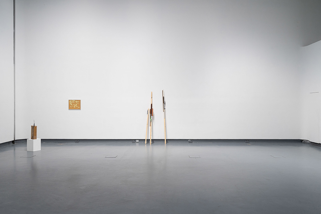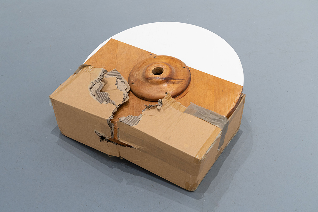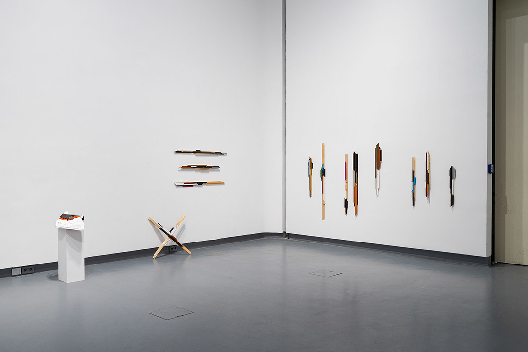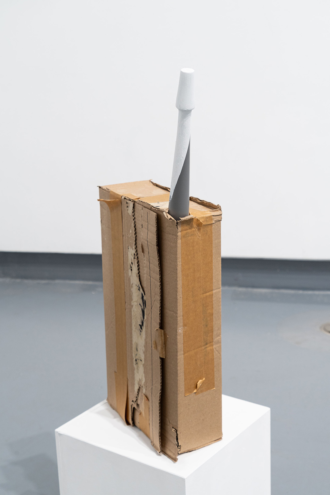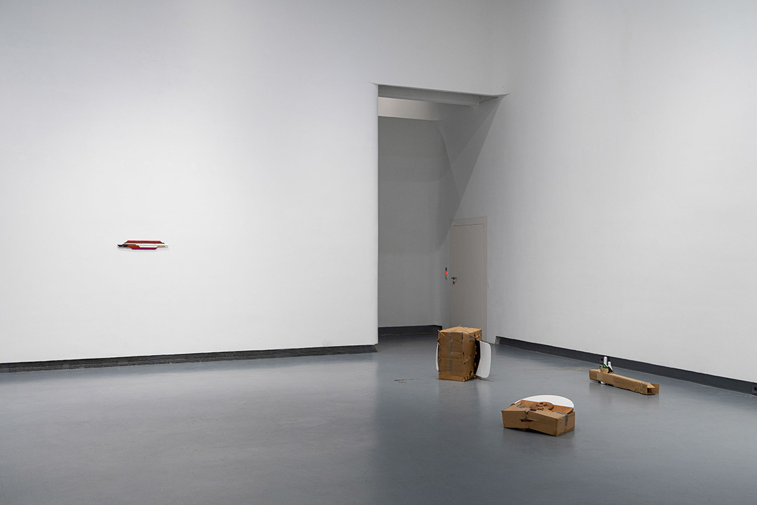 Und so versammeln sich in dieser Ausstellung Werkgruppen, die von zwei Herangehensweisen geprägt sind. Auf dem Boden stehen Skulpturen, irgendwo zwischen fragilem Gerüst und raumsprengender Geste. Prägnant geformte Körper, sperrige Fragmente einstiger Gebrauchsgegenstände, die grob und gewaltsam in rechteckige Pappkartons gesteckt wurden und dabei zu Fremdkörpern mutieren. Unbeholfen ragen sie aus den abgestellten Boxen heraus, die weißen Übermalungen auf den überstehenden Bereichen lassen nur von einzelnen Standpunkten aus den Anschein von Verschmelzung mit ihrem Träger erahnen. Erst bei näherem Herantreten wird auch die Fragilität der Pappkartons ersichtlich, die trotz vermeintlicher Standfestigkeit durch geflickte, nur mit Klebeband gehaltene Bruchstellen eigene Verletzlichkeiten aufweisen. Was bleibt, ist ein Gefühl von unerfüllter Zugehörigkeit, Anpassungs- und Ausbrechungswillen und dem Aufdecken tarnender Maskierungen.