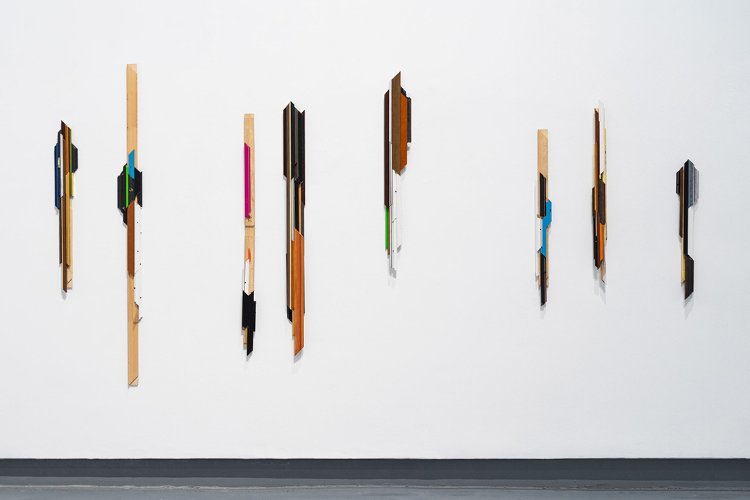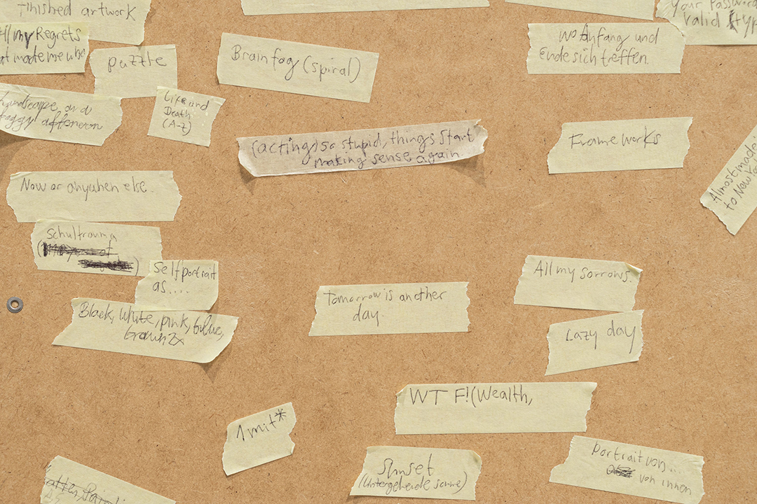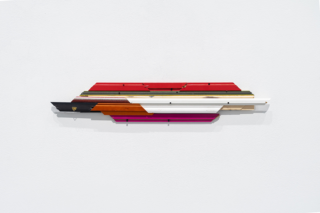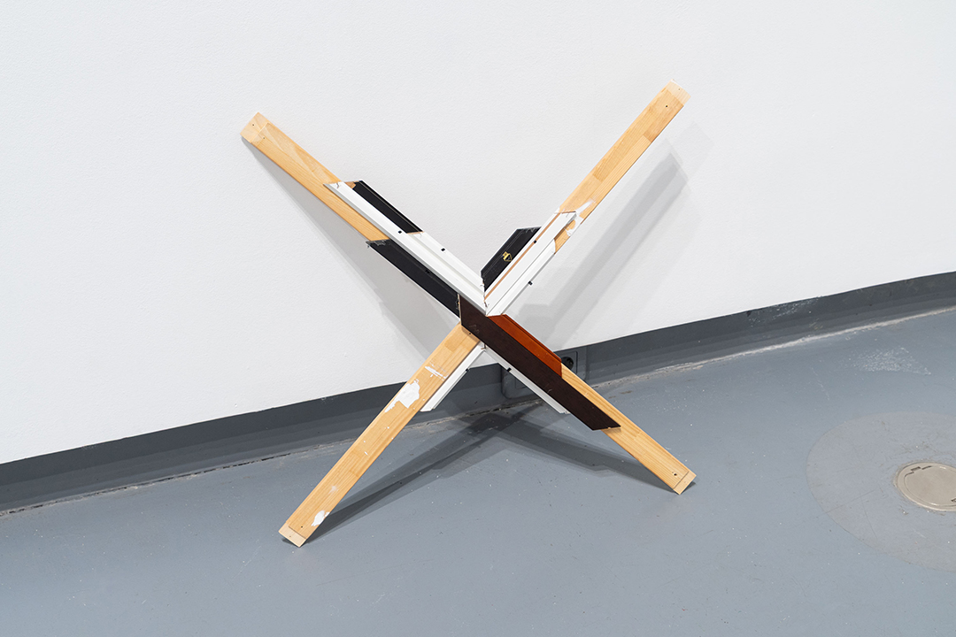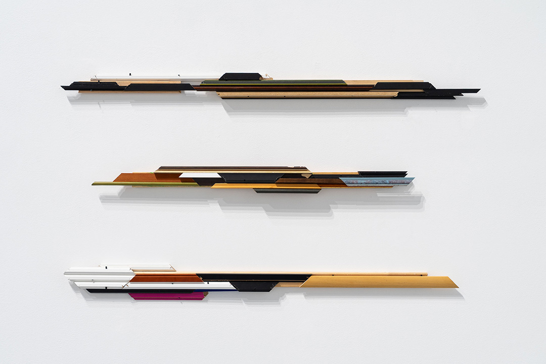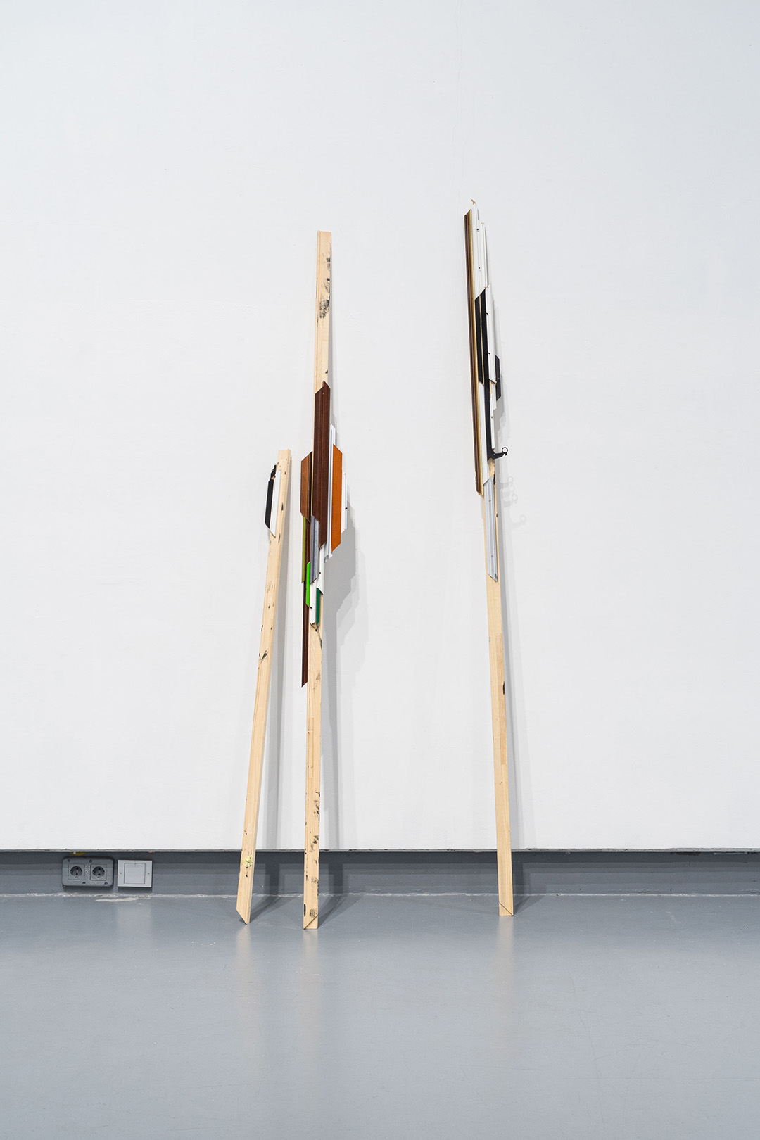 In den linearen Formen der daneben existierenden Wandobjekte sind wiederum eher systematische Prozesse am Werk gewesen. Die bunten, scharfkantigen Arbeiten bestehen aus einzelnen Keilrahmen abgespannter Leinwände und den fragmentierten Leisten verschiedenster Bilderrahmen. Innerhalb alter Farbreste oder gesplitterter Kanten tragen sie Spuren vergangener Anwendungen und verweisen auf Bilder, die archiviert, abgespannt oder verworfen wurden. Das nicht vorhandene Sujet wird jedoch nicht vermisst – vielmehr scheinen sich die Rahmenfragmente in ihrem Aufeinandertreffen zu emanzipieren, sich von dem einstigen Bild zu lösen und dabei einen ganz eigenen Darstellungsraum zu öffnen. Gerade in der Vielfältigkeit der einzelnen Objekte und deren Präsentationsformen erzählen die Leisten nun eine eigene Geschichte. Mal lehnen sie wie abgestellt an der Wand, dann tänzeln sie melodisch in Form vertikaler Körper an einem vorbei, nur um im nächsten Augenblick in horizontaler Stringenz eine Ernsthaftigkeit zu erlangen, die in ihrer harten Kontur fast einem Waffenschrank zu ähneln scheint. Diesem Arrangement gegenüber dann der einzig heile Rahmen aus Aluminium, rechteckig und isoliert, doch auch hier sucht man vergeblich nach einem Bild. Die Klebebandstreifen, die beiläufig auf der rohen Innenfläche des Rahmens befestigt wurden, tragen schnell niedergeschriebene Wortfetzen. Untitled. Acting so stupid, things make sense again. Selfportrait as…