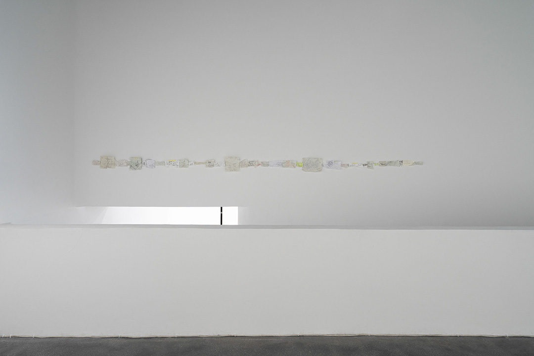 wieder aufgefaltete Zettel bespielen die Rückwand der Galerie, sie sind gezeichnet von Gekritzel, das vorangegangene und wieder verworfene Ideen für die unten zu sehende Ausstellung skizziert und verschmelzen in ihrer faltig-skulpturalen Anmutung schließlich beinahe mit der Architektur des Raumes selbst. Backstage – das Verworfene schwebt wie ein Geist über dem eigentlichen Werk, ist durch die Distanz von der Rückwand zur Empore, von der man es betrachtet, nur schwer zu entziffern. Ein weiterer Moment, an dem noch einmal zurückgespult wird. In den leeren Raum, der noch überhaupt gar nichts zeigt. Von hier bleibt nur ein kleiner Spalt, der einem den Blick nach unten auf die Ausstellung zugleich öffnet und verwehrt. Auf dem Weg zurück dann ein Innehalten, und die Offenbarung: ist dies wirklich noch der selbe Raum, in dem ich mich eben mit Leerstellen und weißen Wänden konfrontiert sah?