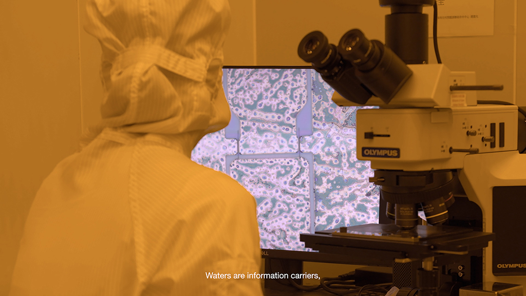 Die international gefragte Produktion von Halbleitern benötigt Tonnen an Wasser. Doch woher kommt das Wasser? Und wer erhält, zu welchen Bedingungen, Zugang dazu? Su untersucht in ihrem Video Particular Waters das komplexe Wassernetz in Hsinchu, Taiwan und stellt dazu vier, mit Meeres-Satellitenbildern bedruckte Halbleiter-Attrappen aus. Dabei unterstreicht sie das hyd-rosoziale Engagement der globalen Halbleiterlieferkette und deren ökologische Folgen.