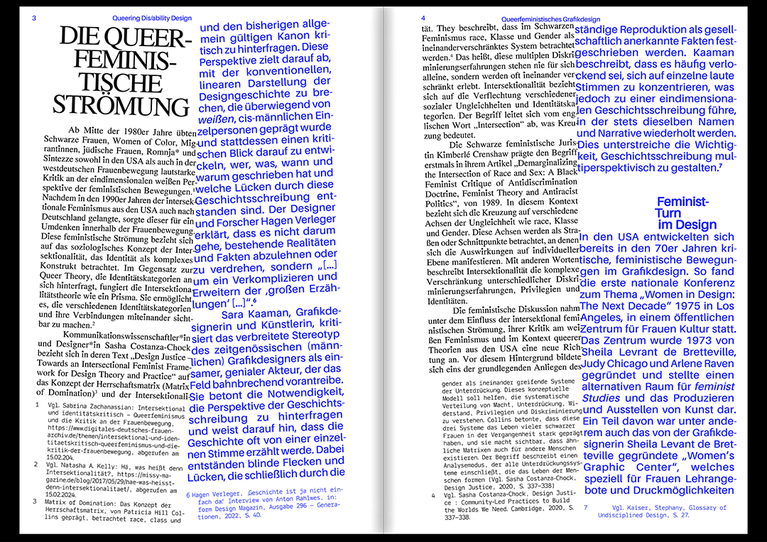 Diese Arbeit lädt zum (kollektiven) Kritisieren, Experimentieren und Neuerfinden queer-feministischer Praktiken für barrierefreies Grafikdesign ein. Ziel ist es, nicht nur den bestehenden westlichen Gestaltungskanon zu hinterfragen, zu hacken und zu transformieren, sondern auch aktiv daran zu arbeiten, Ableismus zu vermeiden und stattdessen eine inklusive und vielfältige Gestaltung zu fördern. Im Fokus steht die Frage, inwieweit die aktuellen Standards zur barrierefreien Gestaltung, einschließlich ihrer ästhetischen Aspekte, verstärkt in kritischen, queer-feministischen Grafikdesign-Praktiken integriert werden sollten. Gleichzeitig wird überlegt, ob möglicherweise die Notwendigkeit besteht, die bestehenden barrierefreien Standards zu überdenken und sie gegebenenfalls durch neuartige, queer-feministische Methoden für barrierefreie Gestaltungspraktiken zu erweitern.