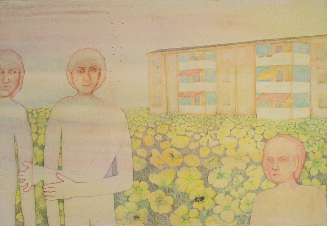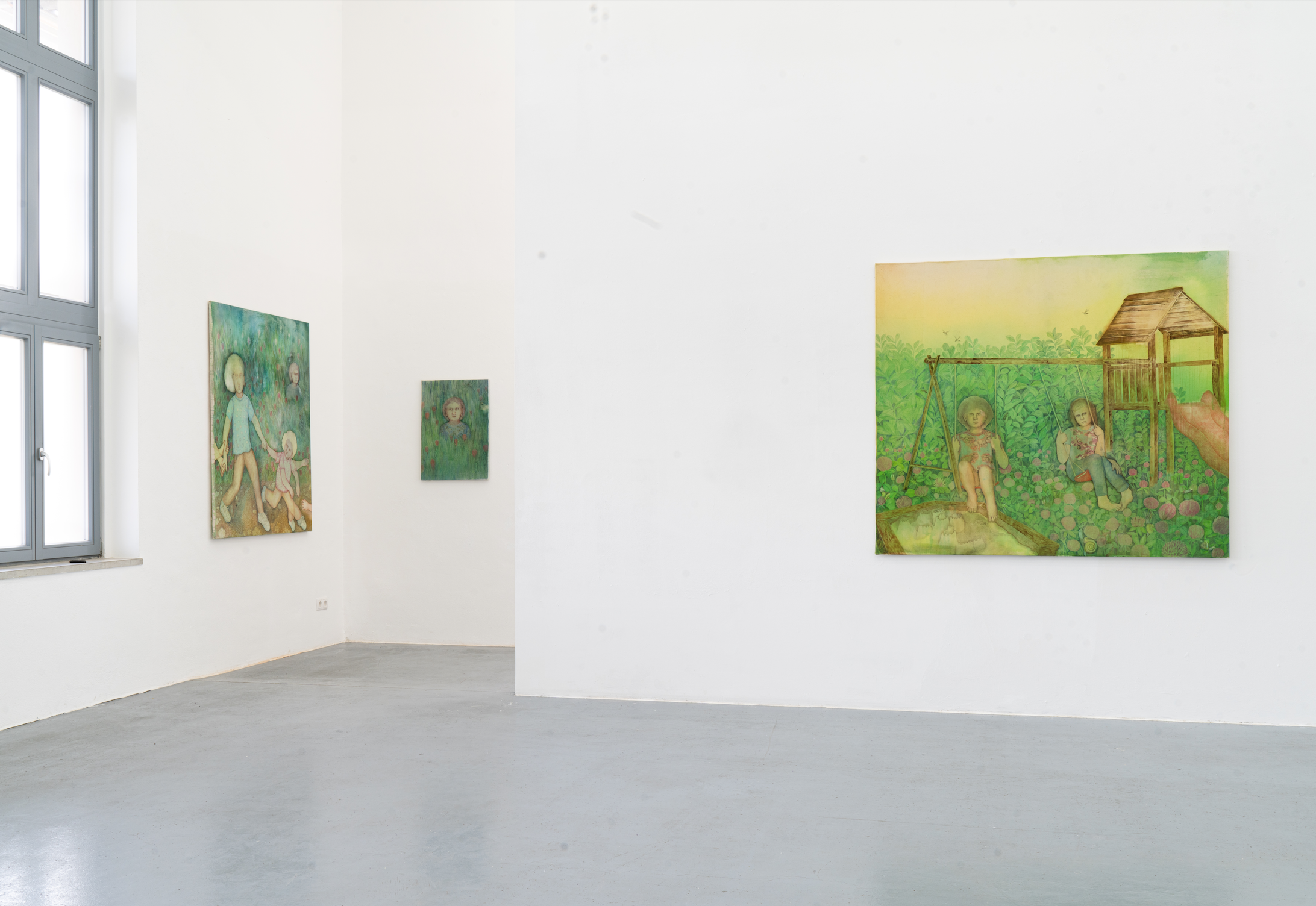 Sie umreißen menschlich anmutende Figuren, die in spielerische und zugleich befremdliche Landschaften/ Bezugsräume gesetzt werden. Blicke begegnen sich nicht, die Atmosphäre bleibt kühl. Hände suchen Nähe, scheitern und verlieren sich im Labyrinth nostalgischer Räume.