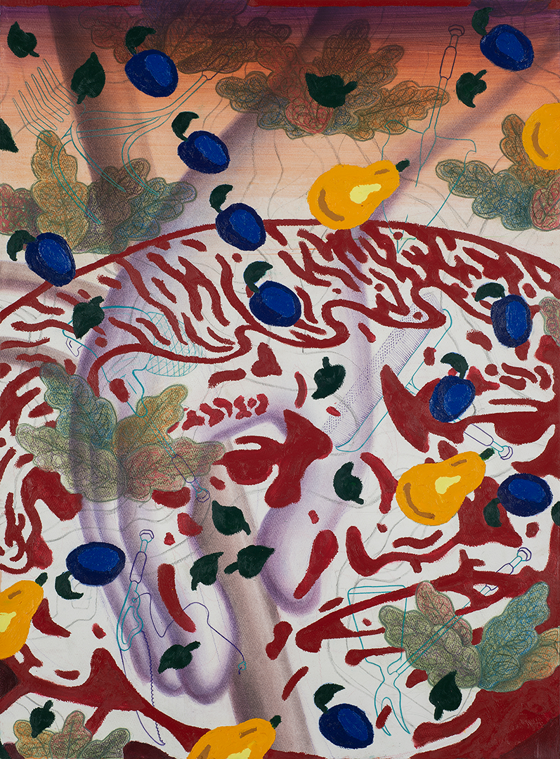 Grundsätzlich interessiere ich mich sehr für den scheinbaren Gegensatz von Beklemmung und ästhetischem Reiz. Ein streng kalkuliertes Verhältnis zwischen Figur und Bildraum bildet in meinem Arbeitsprozess das Fundament. Inhaltlich beschäftige ich mich mit Klischees von Idylle und Anatomie, wobei ich durch formale Eingriffe versuche dem Klischee ästhetische Neuerfindungen abzuringen, die den Bereich der Gewohnheit durchbrechen. Die Polarität von Generischem und Besonderem ist für mich wichtiger Form- und Ideengeber, welcher auch für mein Modell der Figurendarstellung verantwortlich ist und die Schwelle zwischen Apathie und Empathie untersucht. Ein Verallgemeinerungsversuch der menschlichen Gestalt und die Banalität der anderen Bildgegenstände wird kontaminiert durch die Tatsache, dass durch die referenzfreie Handzeichnung das Individuelle und Merkwürdige zwangsläufig mit einfließt.
