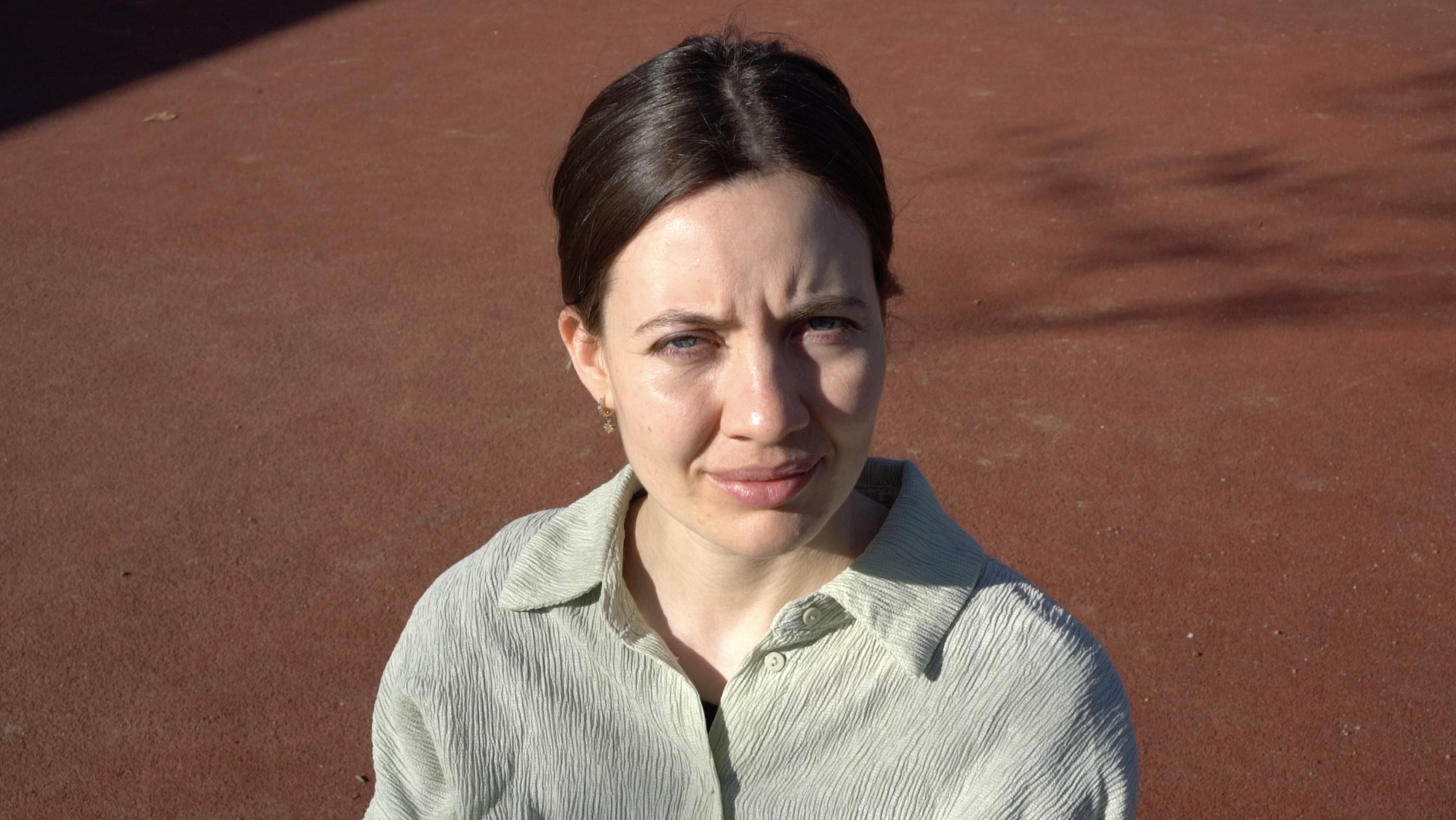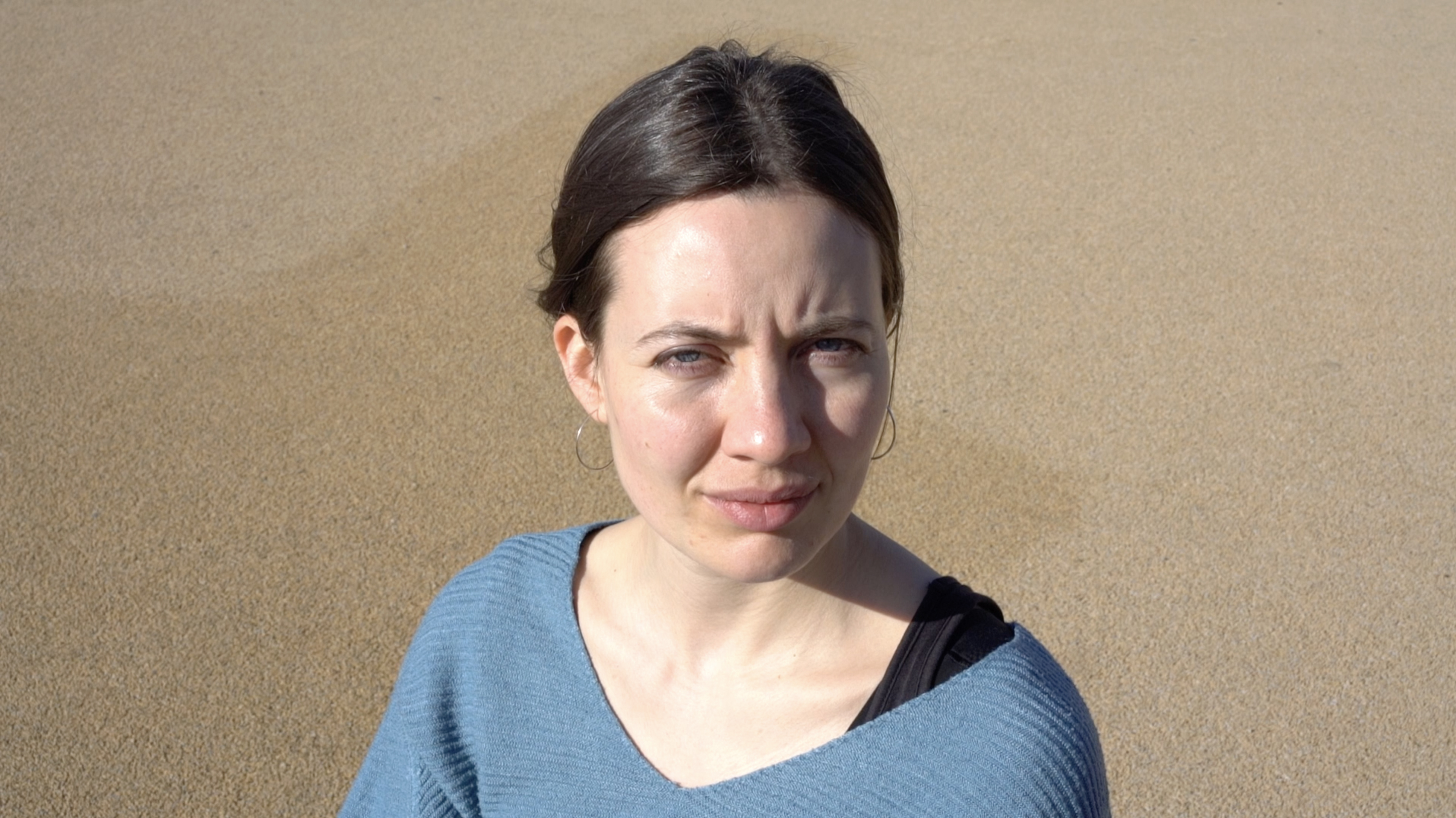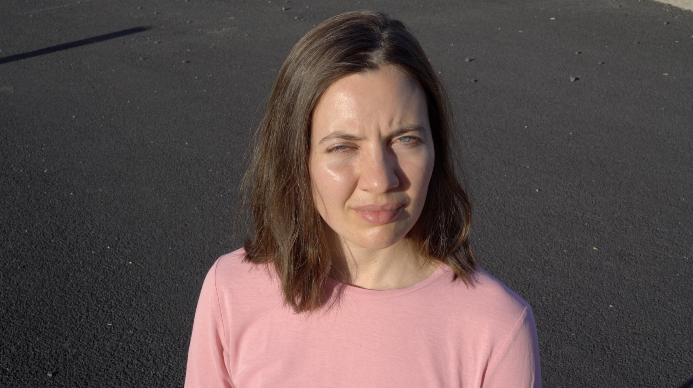 Eine Person wird gefilmt, während sie von der Sonne geblendet wird. Die Sonne fungiert als Gegenspielerin, sie kann wärmen, blenden, beleuchten, verbrennen; sie schreibt sich in das, auf das sie trifft ein, hinterlässt Spuren. Sie ist, nicht zuletzt, existenziell, sie gibt Licht, Leben. Sie ist fundamental mit der Fotografie verbunden. Sie verändert den Gesichtsausdruck der Person und steht sinnbildlich für eine Begegnung mit der Welt, für eine Störung, etwas, auf das es zu reagieren gilt. Der*die Betrachter*in nimmt die Position der Sonne ein. Durch die Dauer der Aufnahme und den permanenten Blick der gefilmten, von der Sonne geblendeten, Person wird der *die Betrachter*in immer wieder auf sich selbst zurückgeworfen. Wie lange kann ein Blick ausgehalten werden? Wer schaut wen an? Welche Art von Dialog entwickelt sich zwischen der filmenden und der gefilmten Person, zwischen der gefilmten Person und dem*der Betrachter*in? Welche Machtstrukturen entstehen durch den Blick, das Schauen, das Zurückschauen?