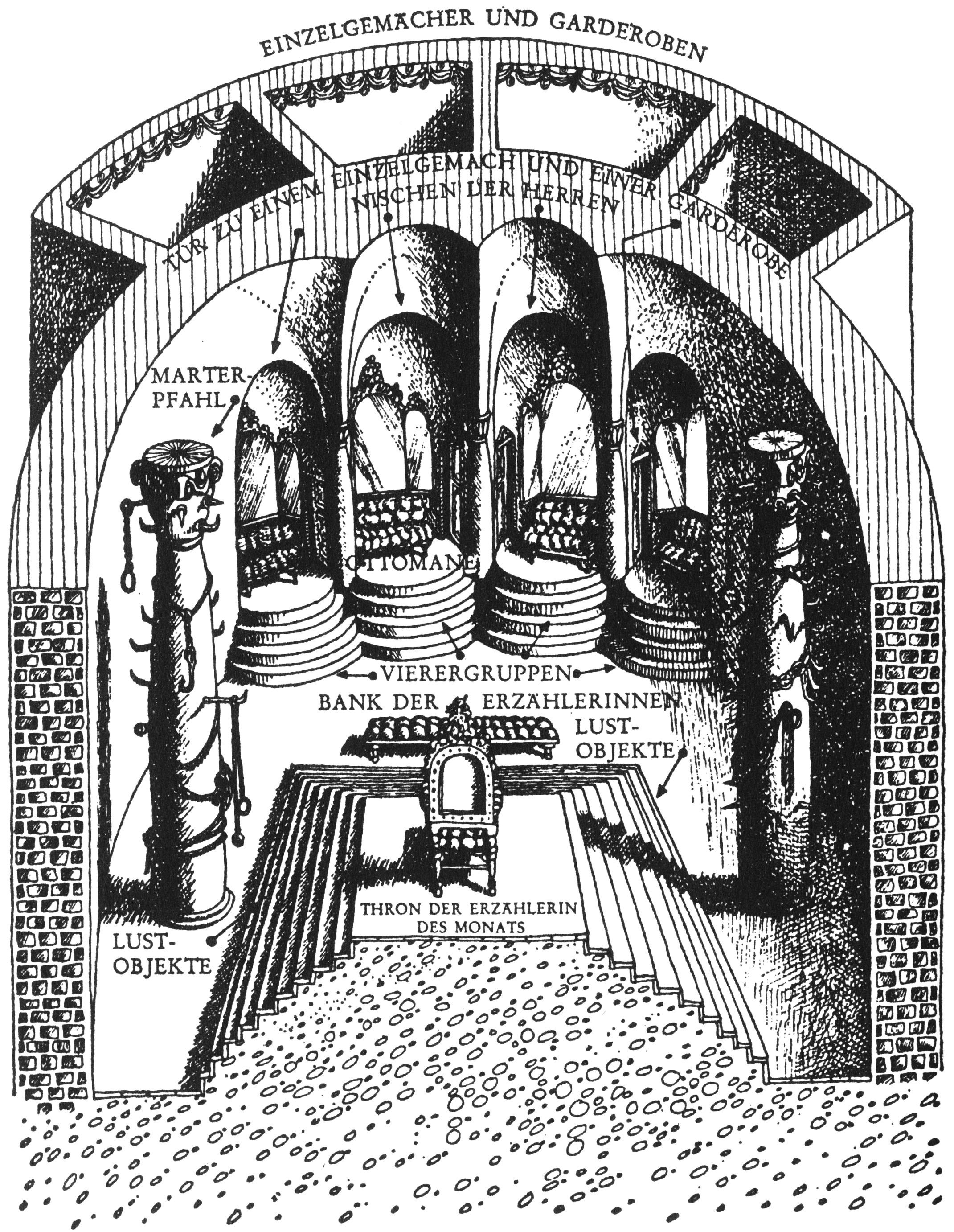 Zeichnung des Versammlungssaals des Schlosses von Silling von Ramón Alejandro in: Rolande Barthes: Sade, Fourier, Loyola, Frankfurt a.M.1974, S. 168.