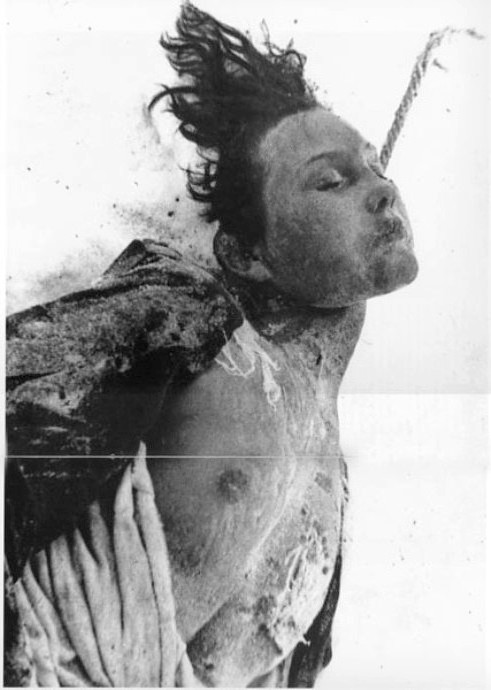 Soya Kosmodemianskaya's corpse, «Pravda» newspaper, January 27, 1942, photo by Sergei Strunnikov.