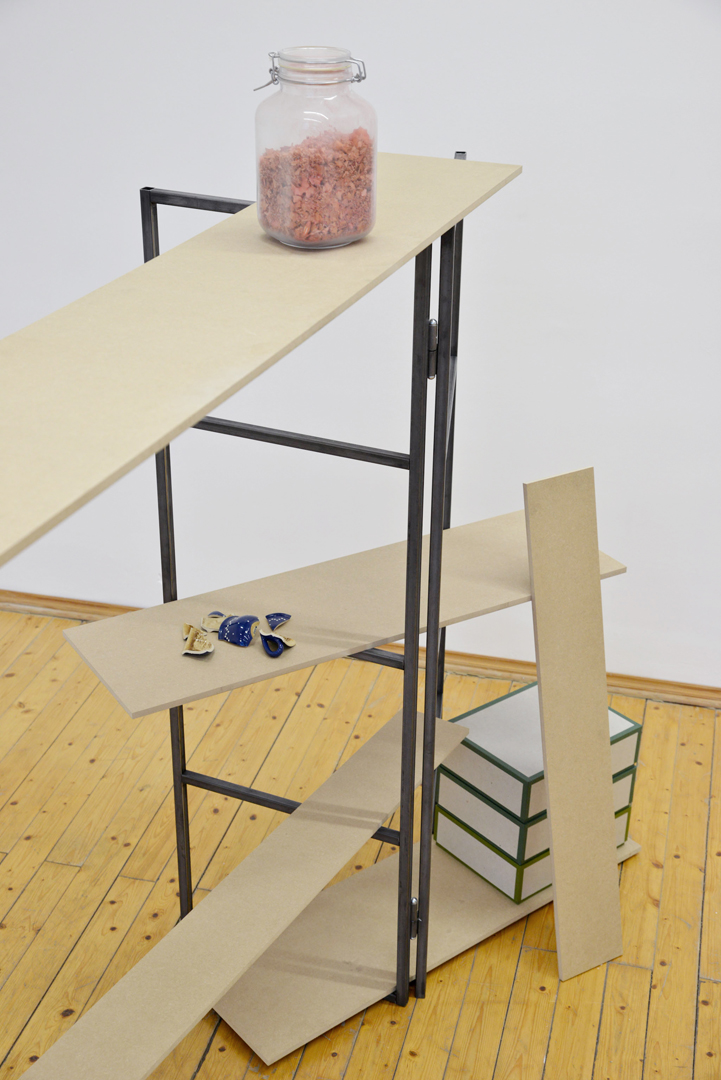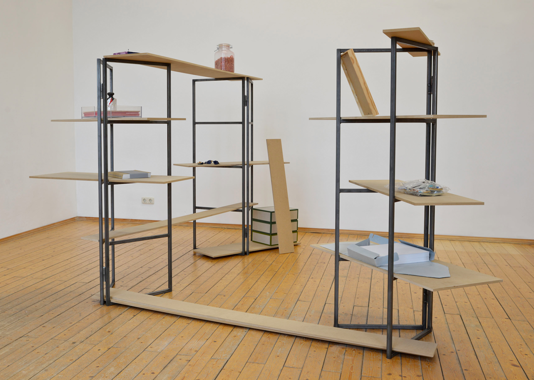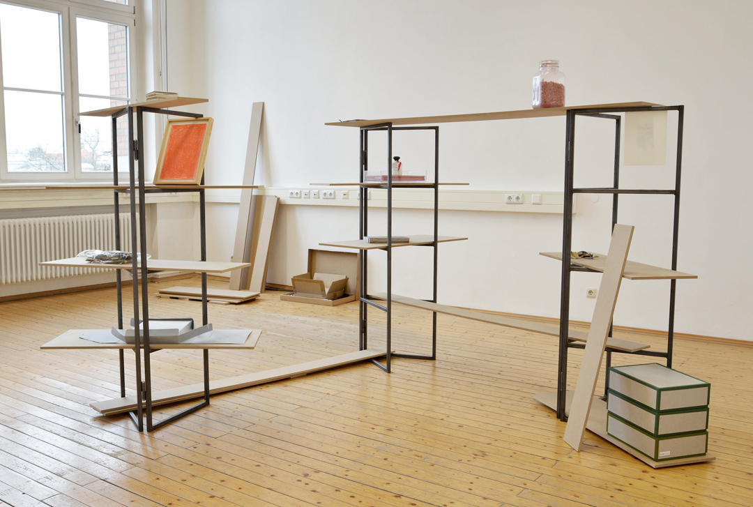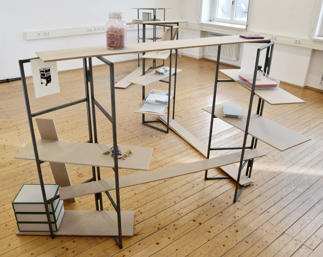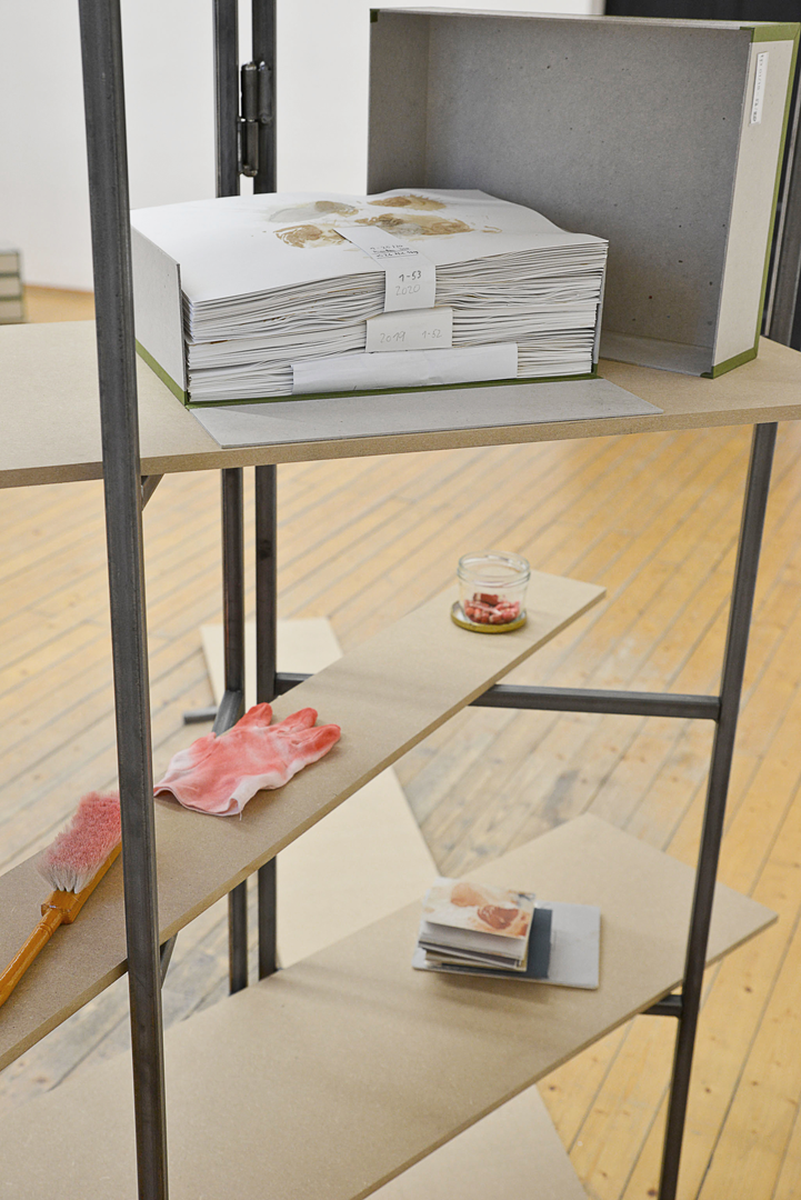 Werkzeug zeigt exemplarisch verschiedene Aspekte meines künstlerischen Prozesses. Die Installation überschneidet sich zwischen Materiallager, Präsentationsdisplay und Archiv. Im Vordergrund steht die prozesshafte Entstehung einer künstlerischen Arbeit und nicht das fertige Werk.
