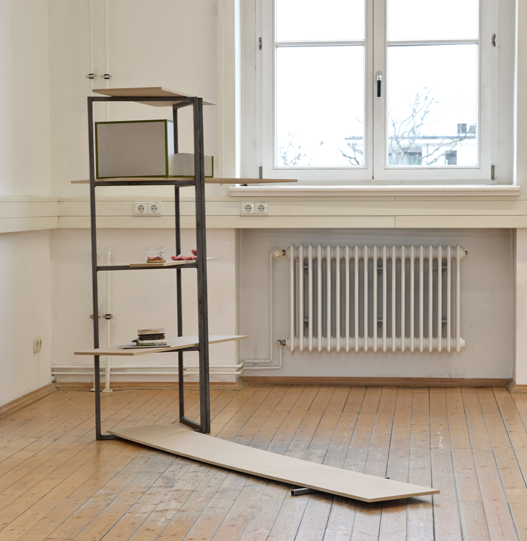 Werkzeug ist ein Regalsystem, das aus vier freistehenden Elementen mit Fachböden besteht. Jedes Element besteht aus zwei leiterartigen Holm-Sprossen-Verbindungen, die durch ein Drehgelenk miteinander verbunden sind. Der Winkel zwischen den beiden Teilen ist flexibel, so dass unterschiedlich breite Bretter eingeschoben werden können.
