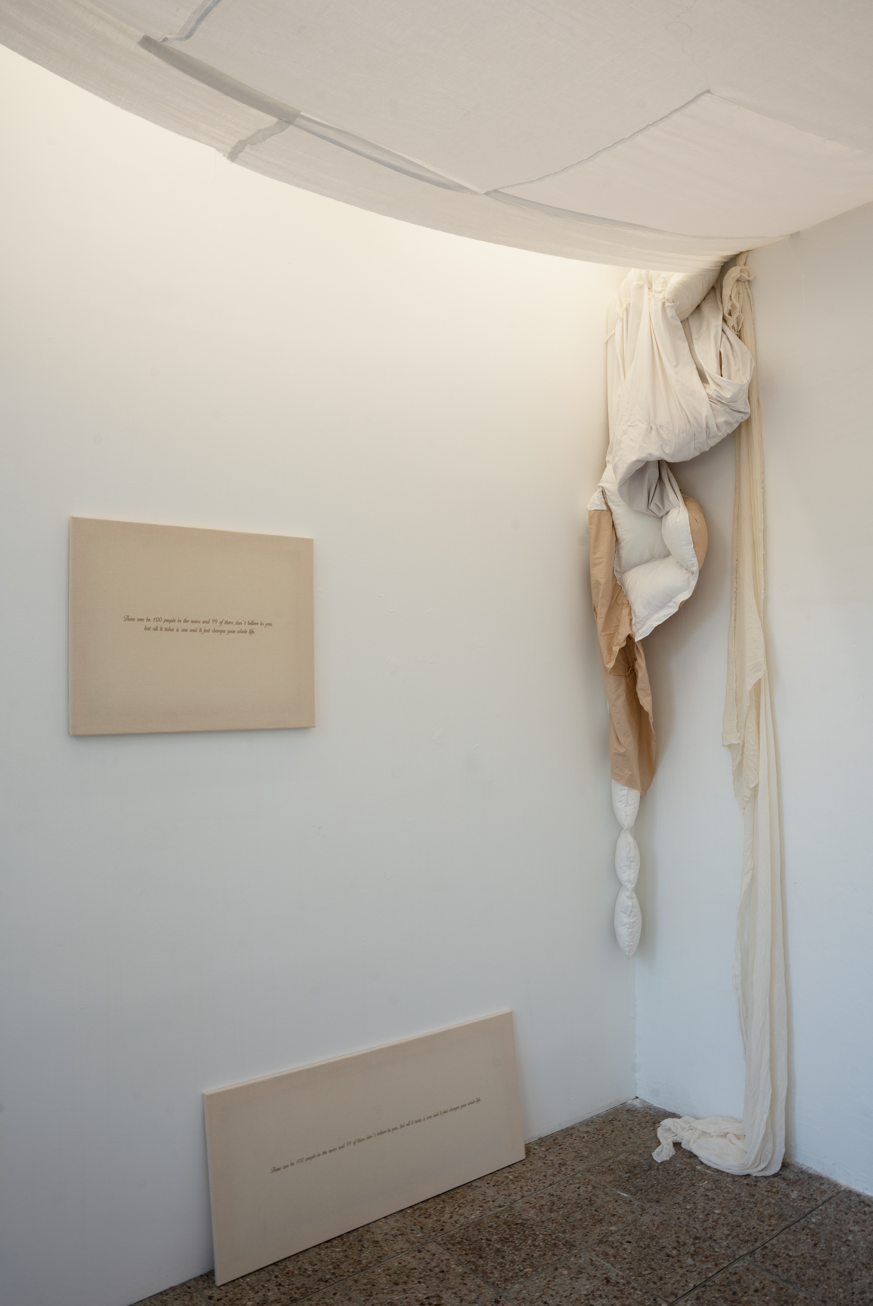 Lea Dorothea Dippold erschafft mit ihrem Werk ein multimediales Zusammenspiel, das sich über die Vergangenheit, die Zukunft und das Hier und Jetzt legt. Mit der Unterstützung von vertrauten Künstler*innen wird, wie in der Tradition des Quiltings, Verschiedenes zusammengebracht. Das Resultat: Ein Prozess – zum Berühren, Lesen und Hören.