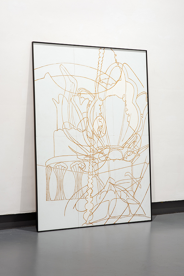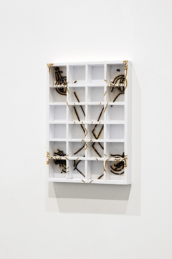 Buck up, Phoenix! Ausgehend von 24 digitalisierten Zeichnungen zu einem Kettenkarussell, hat Ellen Möckel einen Baukasten geschaffen, aus denen Sie einzelne Formen mittels Lasercut- und Gravurapparaten in Material zurückübersetzt. Im Dialog mit der Maschine bilden sich ihre Arbeiten angefangen von der Dekonstruktion über eine variable Neukombination aus dem Raster herausgelöster Fragmente.