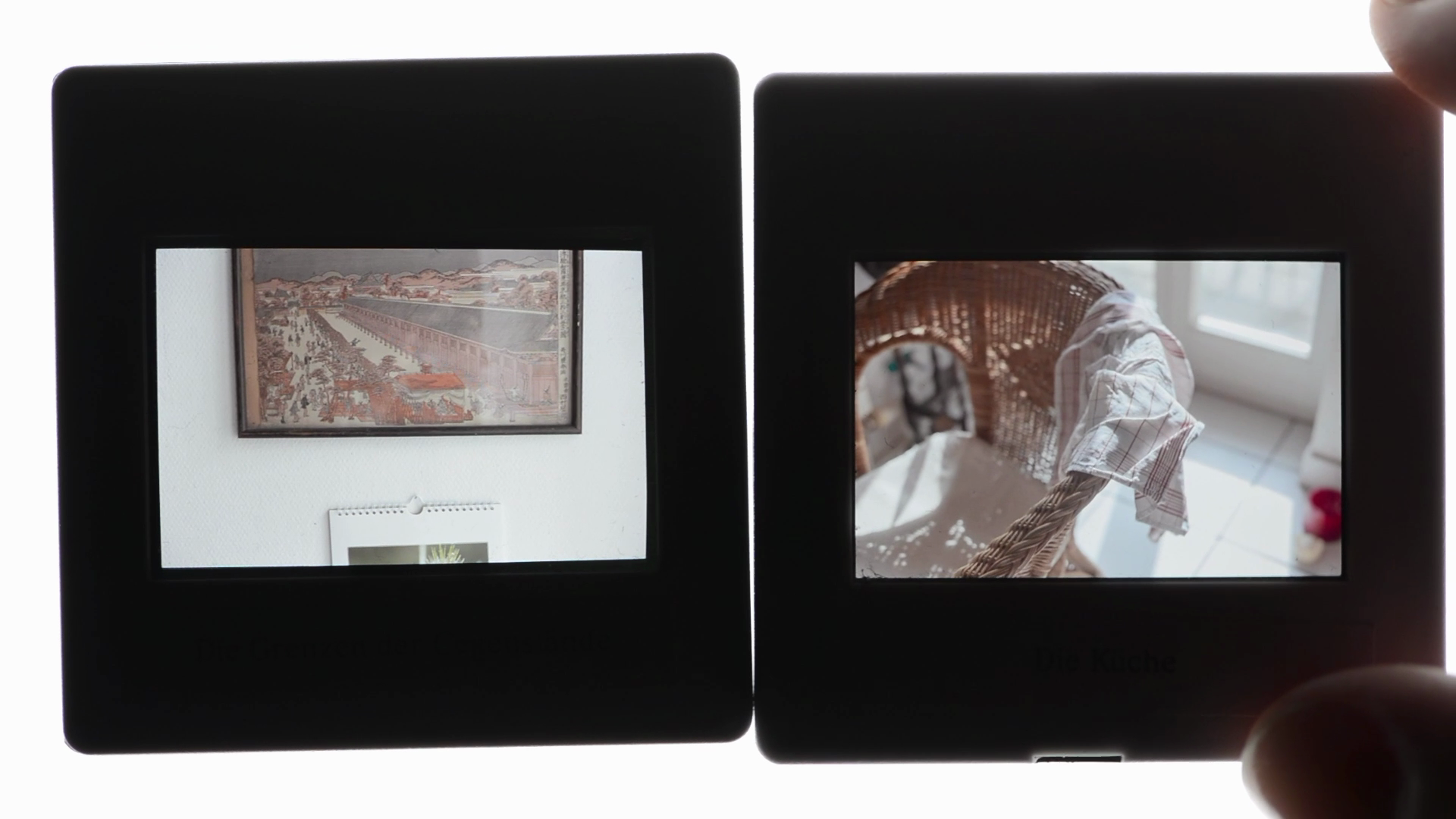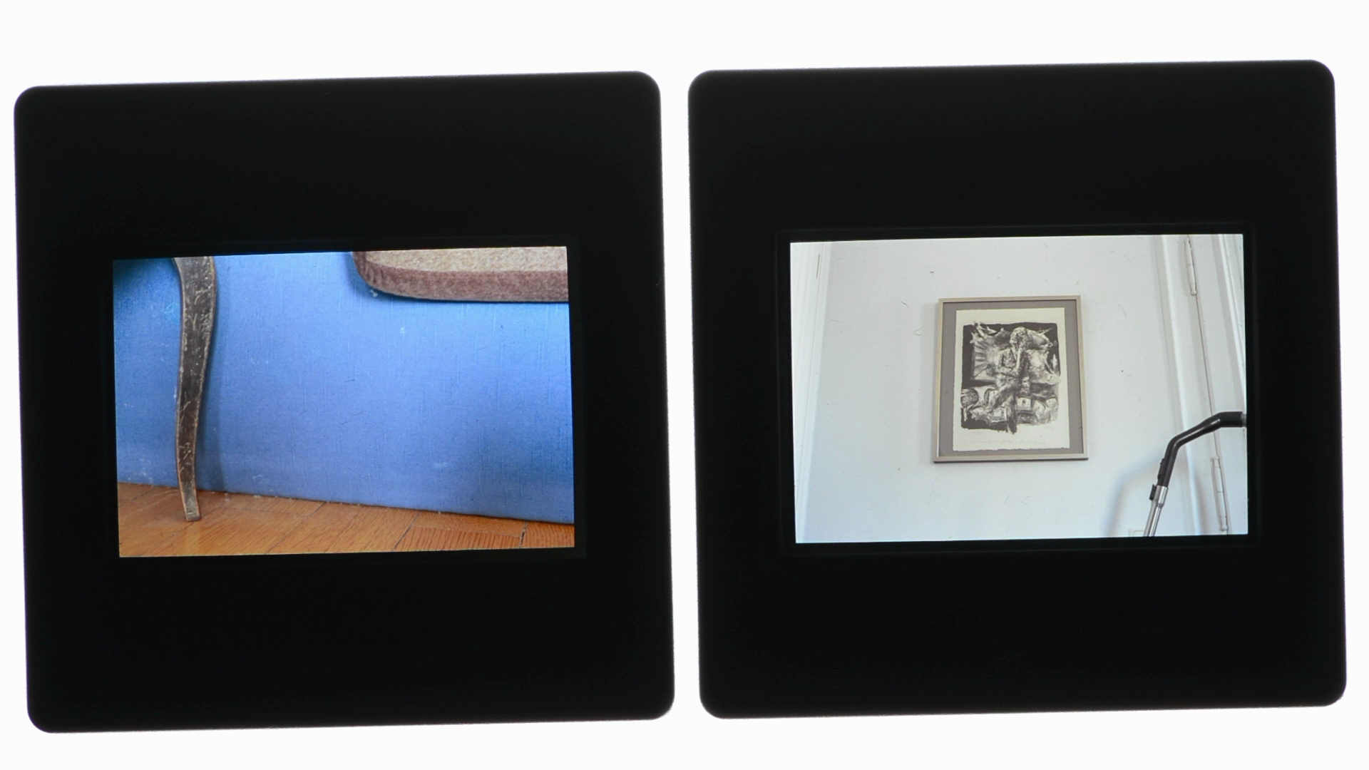 Zaitseva’s photographs appear in the performance as small slides that the viewers examine through a magnifying glass on the lightboxes. The struggle with the medium—the desire to both conceal the image and reveal it to the viewer, —is reasoned by the ambiguous status of these photographs. On the one hand, Christabel, the owner and author of the ensembles of things, didn’t give permission for their publication. It feels ethically questionable to show them widely available. On the other hand, the images at the same time have a second author: Natalia Zaitseva, who also lived her life among these things and wrote her own story over them.