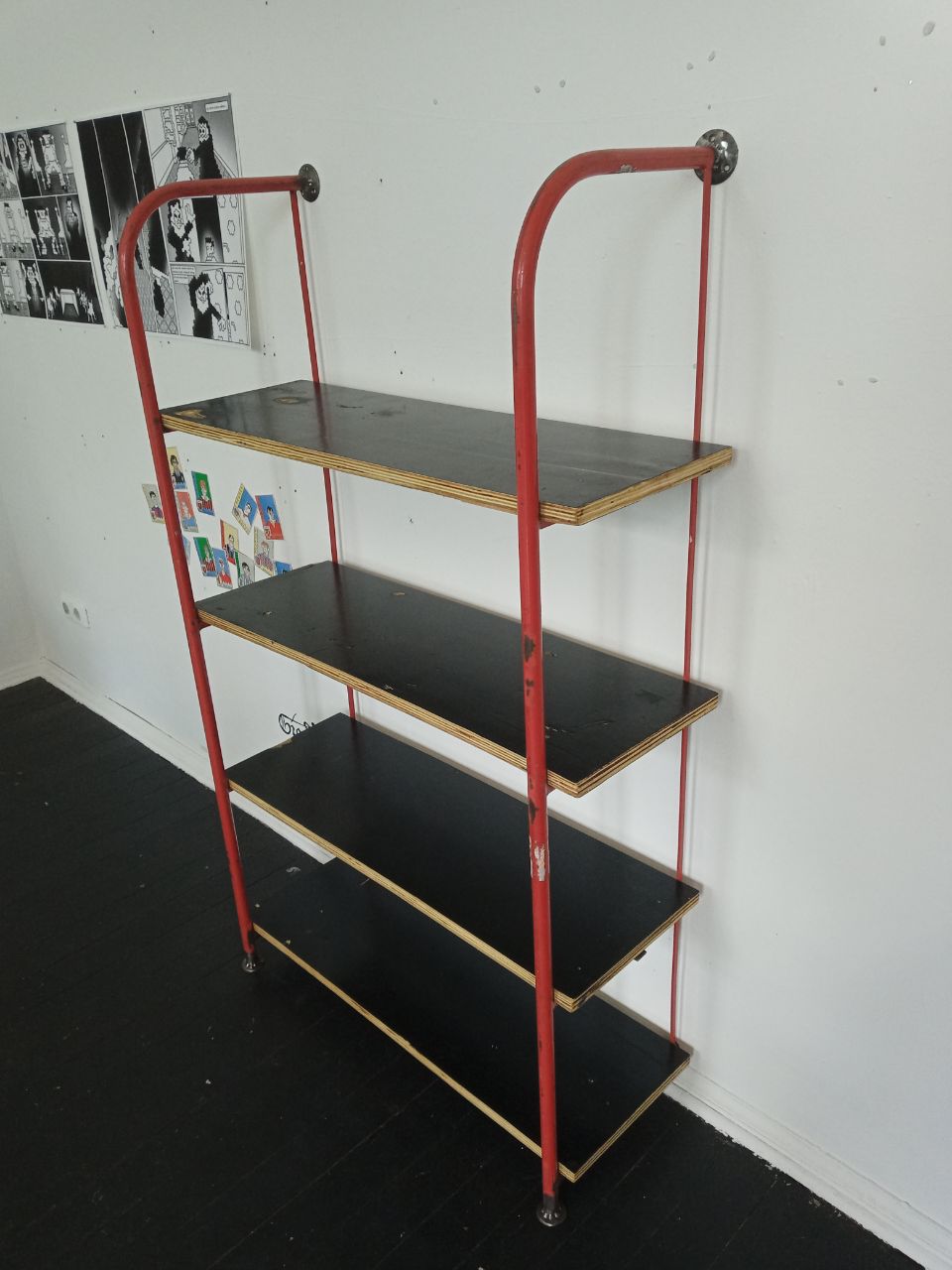 Rotes Regal: Gestell aus Schrott, Böden aus ehemaligen Betonschlungsplatten aus dem Müllcontainer, 2024