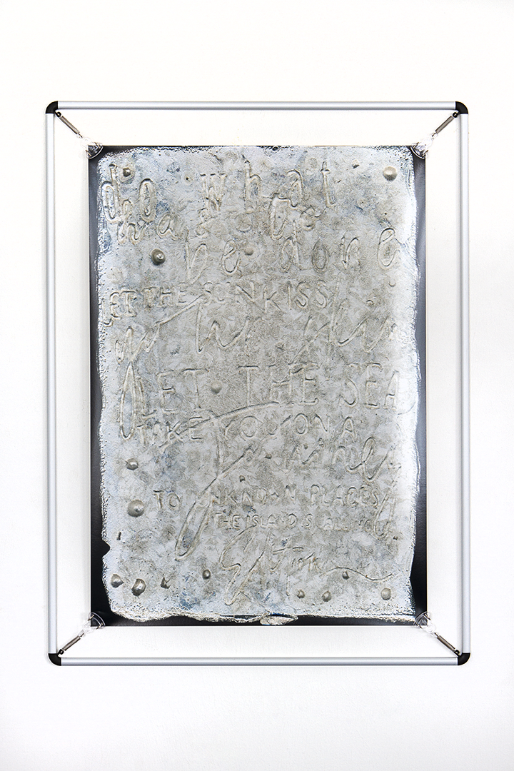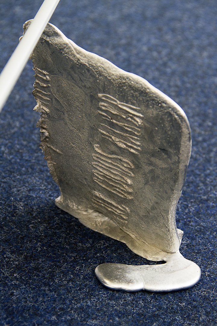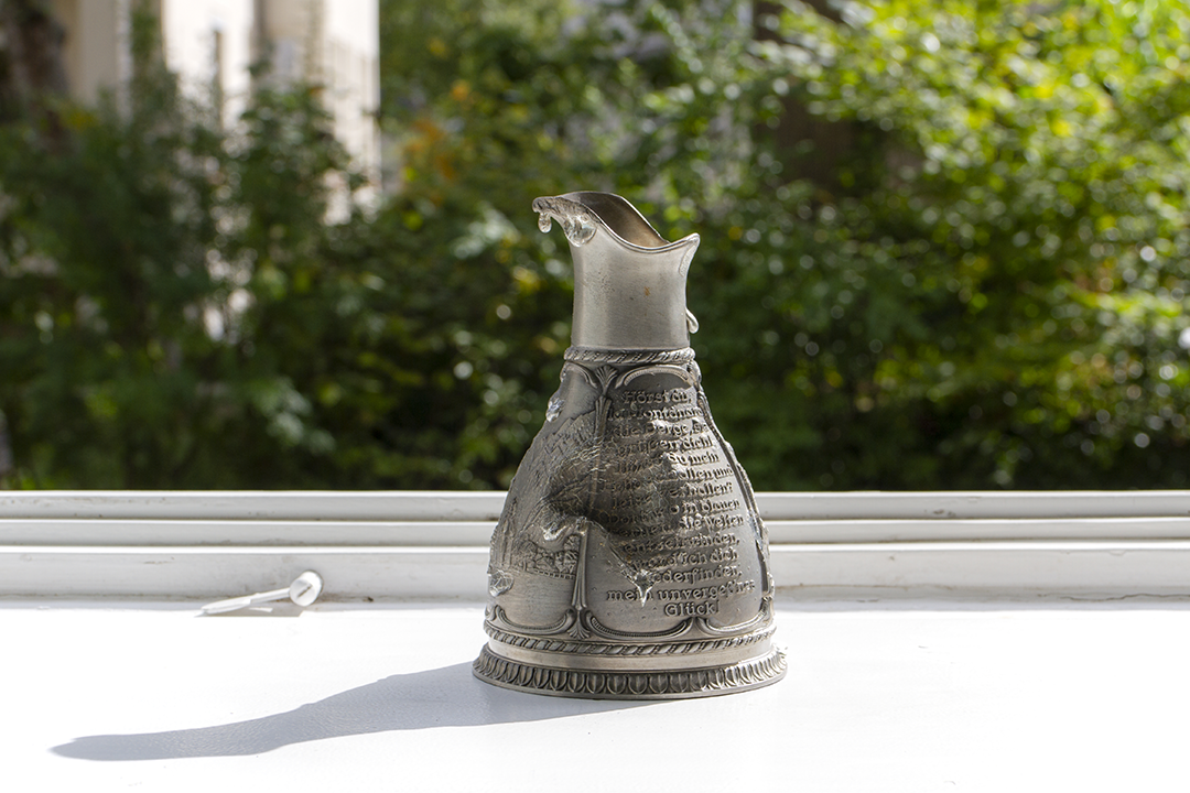 „Hörst du mein Echo schallen und leise verhallen? Dort wo in blauen Fernen die Weiten entschwinden, werd’ ich dich wieder finden, mein unvergessenes Glück!“ — ist zu lesen auf Sweating Vessel, der triefenden Zinnvase aus der Biedermeier-Zeit, die den zentralen Werkstoff der Arbeit bestimmt. Bis ins 19. Jahrhundert fand Zinn seine Hauptverwendung als weit verbreiteter Träger für Gebrauchs- und Ziergegenstände bürgerlicher Haushalte.