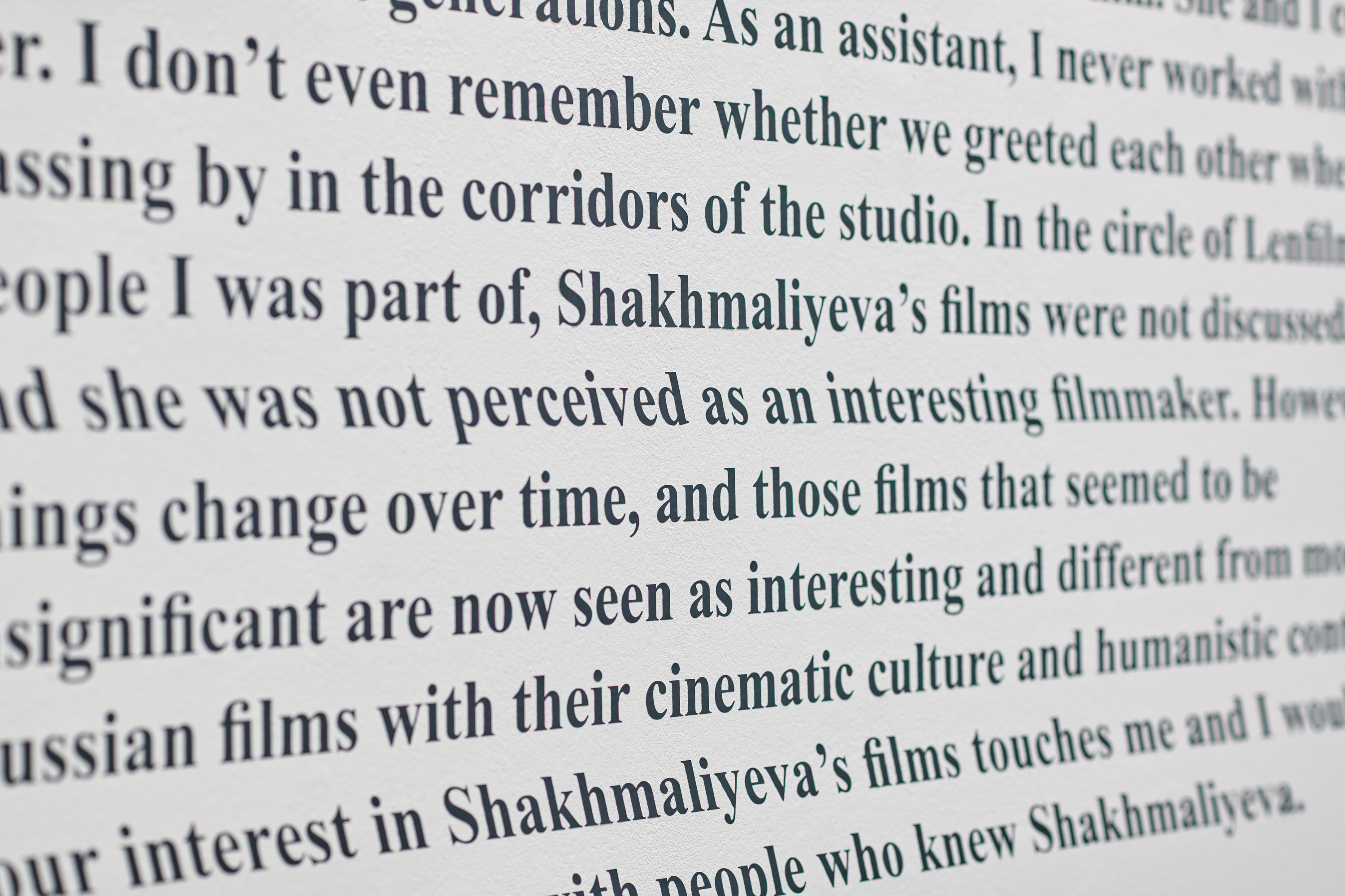 Die Arbeit director [A.S.] implementiert eine Suche nach der bis jetzt unerforschten sowjetischen Filmemacherin Ayan Shakhmaliyeva und thematisiert ihre Unsichtbarkeit als Frau im Kino. Die Recherche, die Lücken sichtbar macht, die niemals geschlossen werden können, schafft einen Raum, um über das Schicksal vieler anderer unbekannter Frauen nachzudenken. Im Fall von Ayan, einer gebürtigen Aserbaidschanerin, sind Geschlecht, ethnische und koloniale Identitäten miteinander verflochten. Was lässt sich aus den wenigen Quellen und Filmen von Ayan erfahren? Wie lassen sich Ereignisse die am Rande der Geschichte übersehen wurden hinterfragen? Verwendung der Montage stellt die Frage nach der Macht über die Erzählung. Während der endgültige Filmschnitt eine Vollendung impliziert, ist das Filmmaterial nie wirklich abgeschlossen, weil etwas herausgeschnitten oder gelöscht wurde. Filmische Ansätze der Installation entfalten verschiedene Erzählebenen, die wie ein dekonstruierter Film im Raum funktionieren.