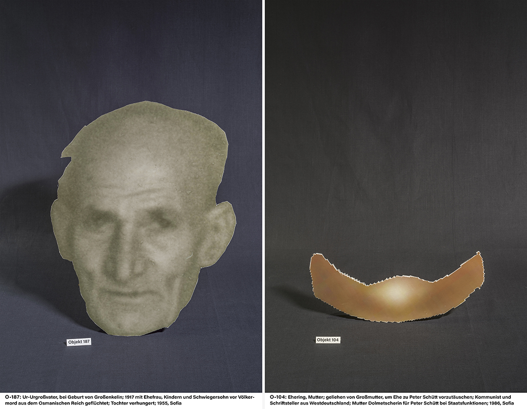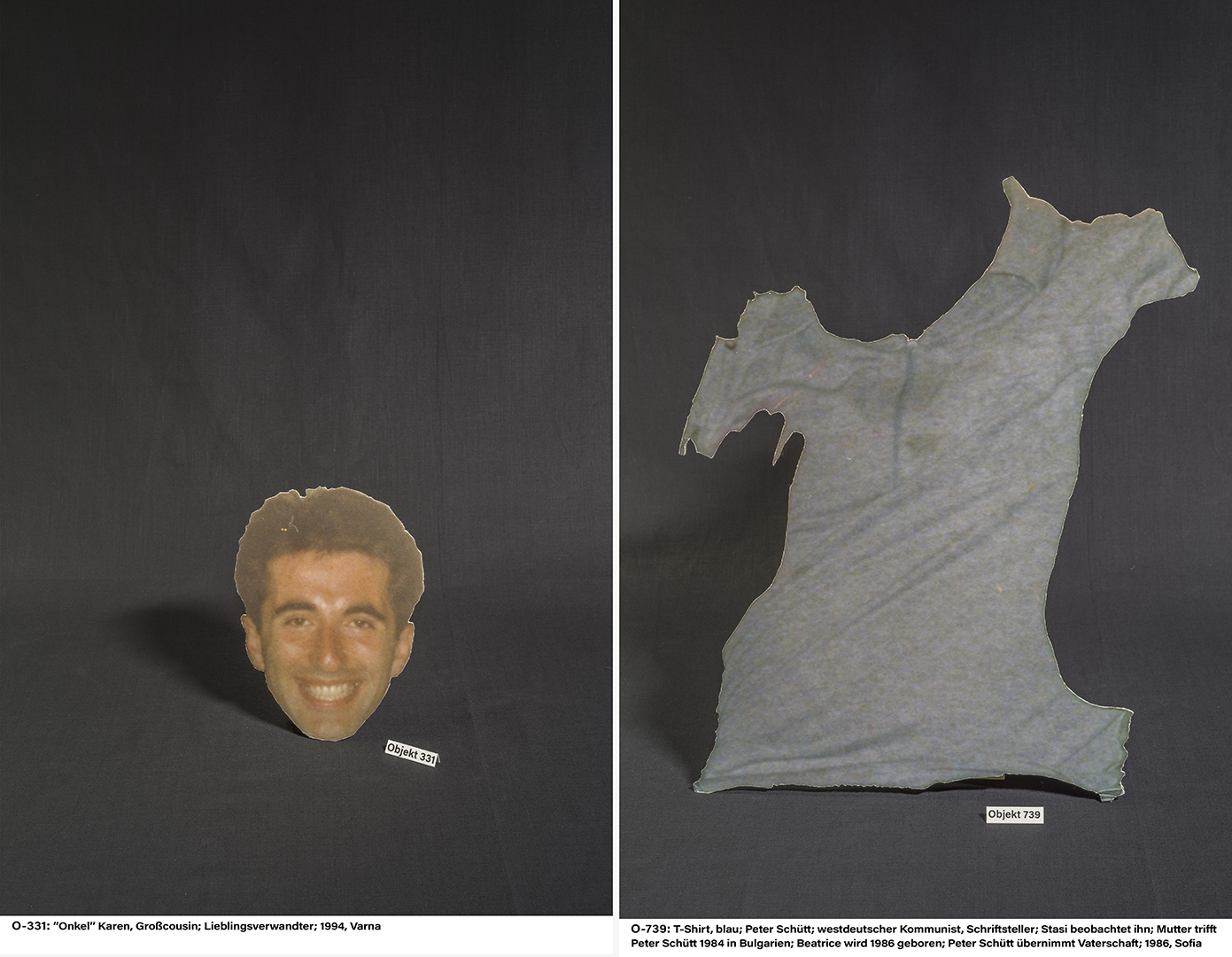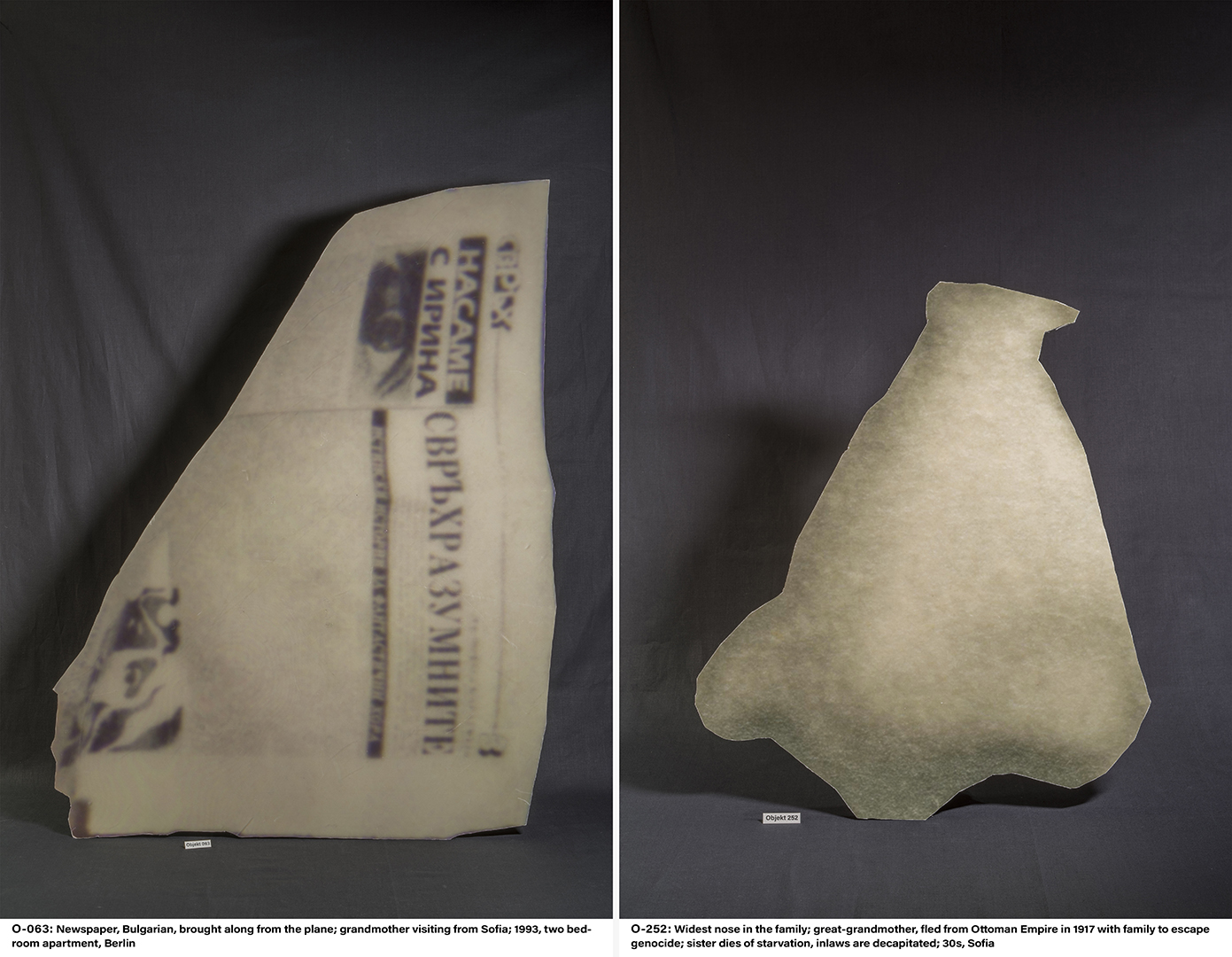 Ich habe alle Familienfotos gescannt, die mir übrig geblieben sind. Sie wurden in Bulgarien und Deutschland zwischen den 1930er und 2000er Jahren aufgenommen. Die Fotos habe ich digital auseinandergeschnitten und tausende von Objekten extrahiert wie Spielzeug, Möbel, eigene und fremde Körperteile. Zu jedem dieser Objekte schreibe ich etwas auf. Woran es mich erinnert oder Wissen über dessen Ursprung und Bedeutung. Als nächsten Schritt habe ich die vergroesserten Elemente auf Fine Art Papier ausgedruckt und auf Kunststoffmaterial montiert, und in einem körperlich aufwändigen Prozess erneut ausgeschnitten. Jetzt sind die einzelnen Elemente aus der Begrenzung des viereckigen Fotos wieder in räumliche Objekte übersetzt worden.