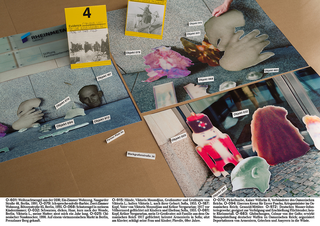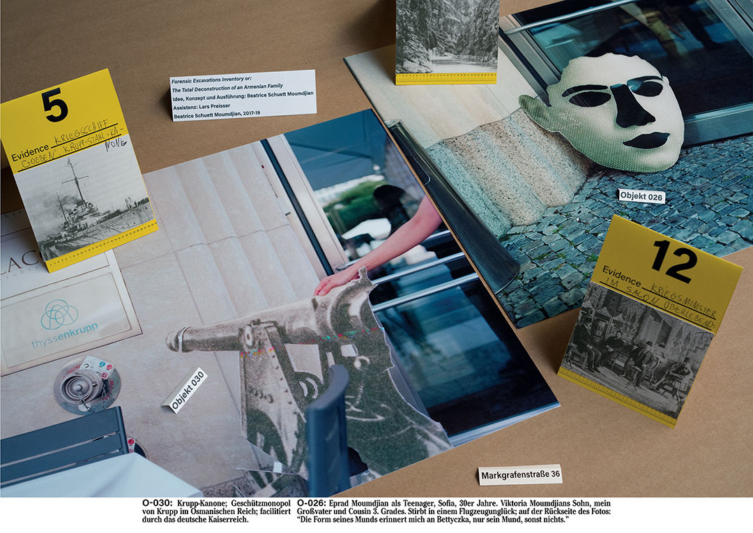 Zusätzlich zu meinen Familienfotos habe ich für beide Projekte auch historische Fotos verwendet, die mit dem Armenischen Genozid zu tun haben. Ich habe Waffen und persönliche Gegenstände der Deutschen und Türkischen Stabsangehörigen ausgeschnitten, die den Genozid facilitiert haben. Für Kunst im Untergrund habe ich die Objekte vor spezifischen, politisch aufgeladenen Orten installiert und fotografiert, wie der Stasi-Zentrale Berlin, und vor den Toren der Waffenhändler.
