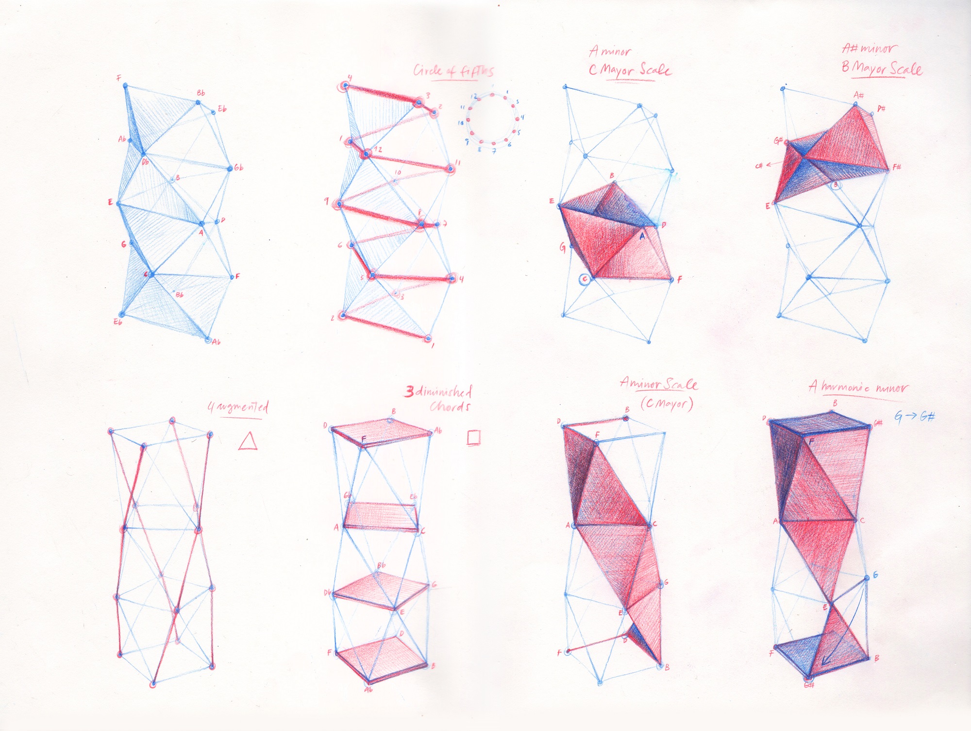 Aus einer allgemeinen Perspektive heraus betrachtet, beschreibt die Harmonie die Ausgewogenheit der Proportionalität zwischen verschiedenen Teilen eines Ganzen und ihr Ergebnis impliziert immer Schönheit. In der Musik beinhaltet das Studium der Harmonie die Akkorde und ihre Konstruktion, sowie ihre Progressionen und die Prinzipien der Verbindung, die sie bestimmen. Begriffe wie Harmonie, Rhythmus, Konsonanz sind gemeinsame Elemente in verschiedenen Disziplinen, spielen aber vor allem eine fundamentale Rolle in Musik und bildender Kunst sowie im Design. Seit Mitte 2015 entwickle ich ein Projekt, welches die strukturellen Beziehungen zwischen Musik und Form in Bezug auf ihre Grammatik und ihr Verhalten untersucht, im Besonderen die Beziehungen von musikalischer Harmonie und Geometrie.