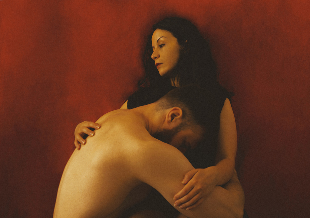 In "Study of Two Figures", Dayrwan draws on archetypal motifs such as Edvard Munch’s Love and Pain and the traditional Pietà. Her photographic staging references their aesthetic language while subverting expected connotations, inviting viewers into a space of emotional ambiguity and layered symbolism.
