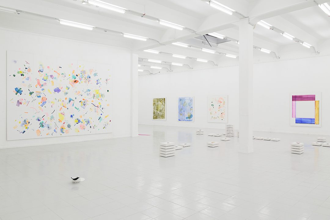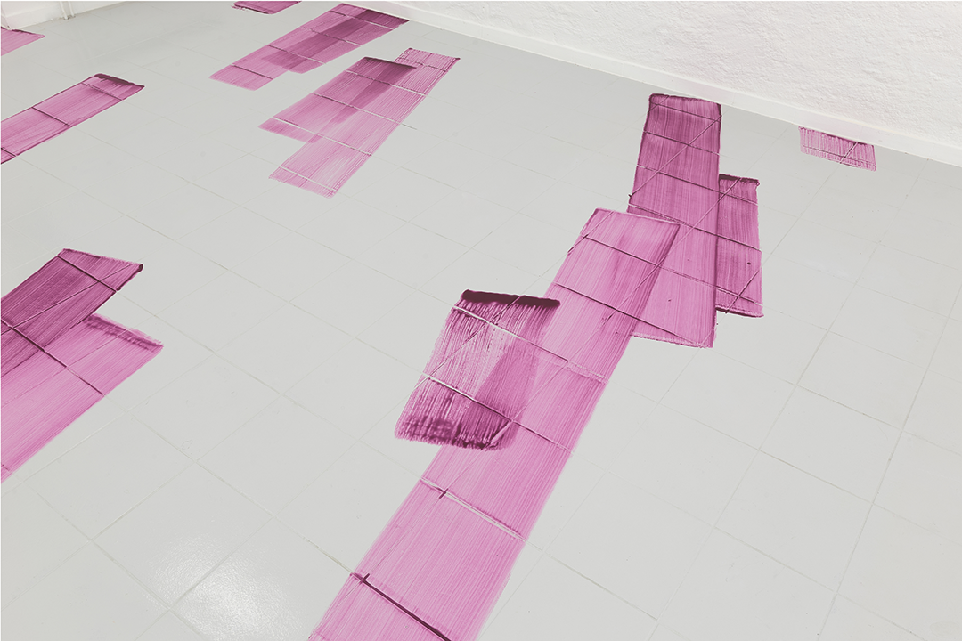 10.16 (Coming back to where I started) / Öl auf Hartfaserplatte / 200 x 163 cm / 2019; Painting as a horizontal field (of study) / Farbleim auf Fliesen / Dimension variabel / 2020