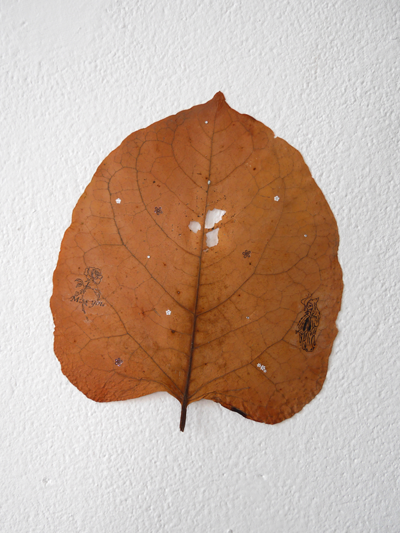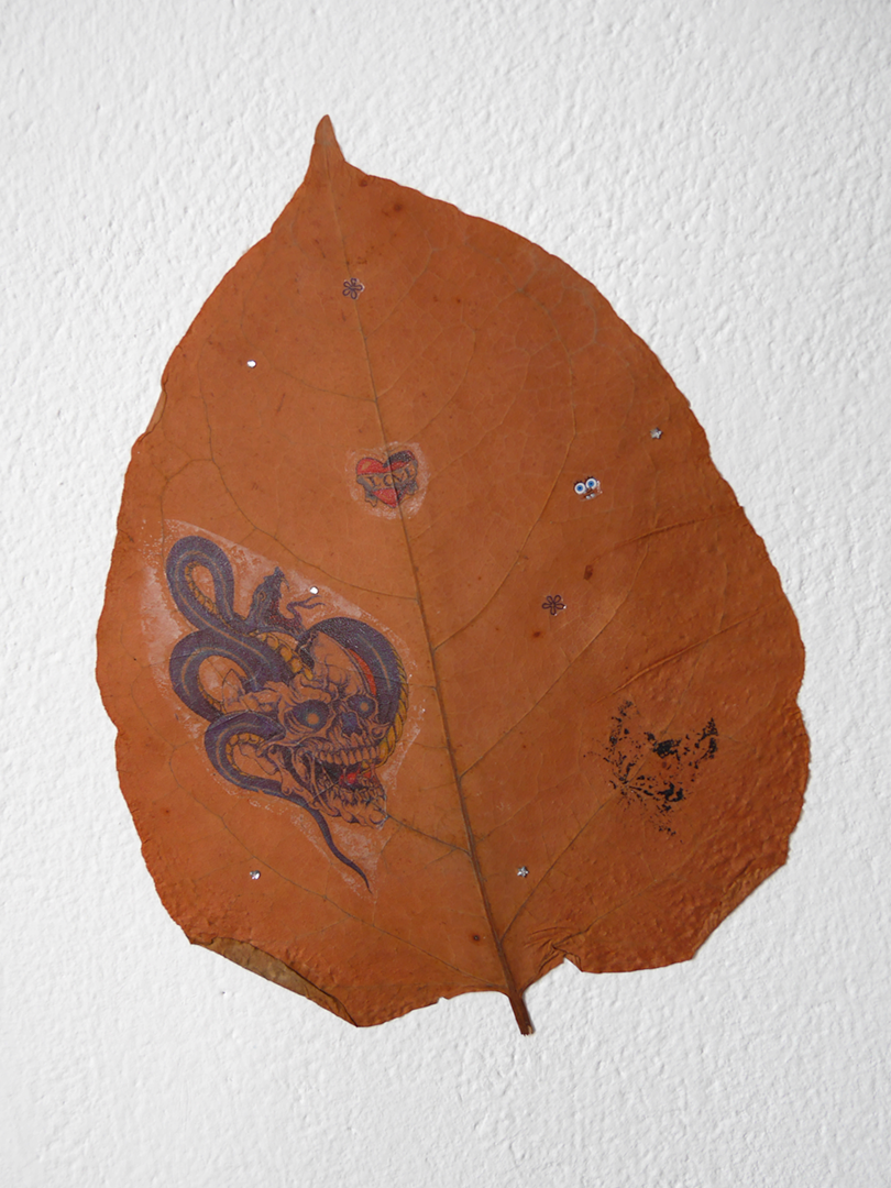 Pressed leaves (unknown plant), spongebob nail stickers, temporary tattoos, Essence bling bling nail stickers