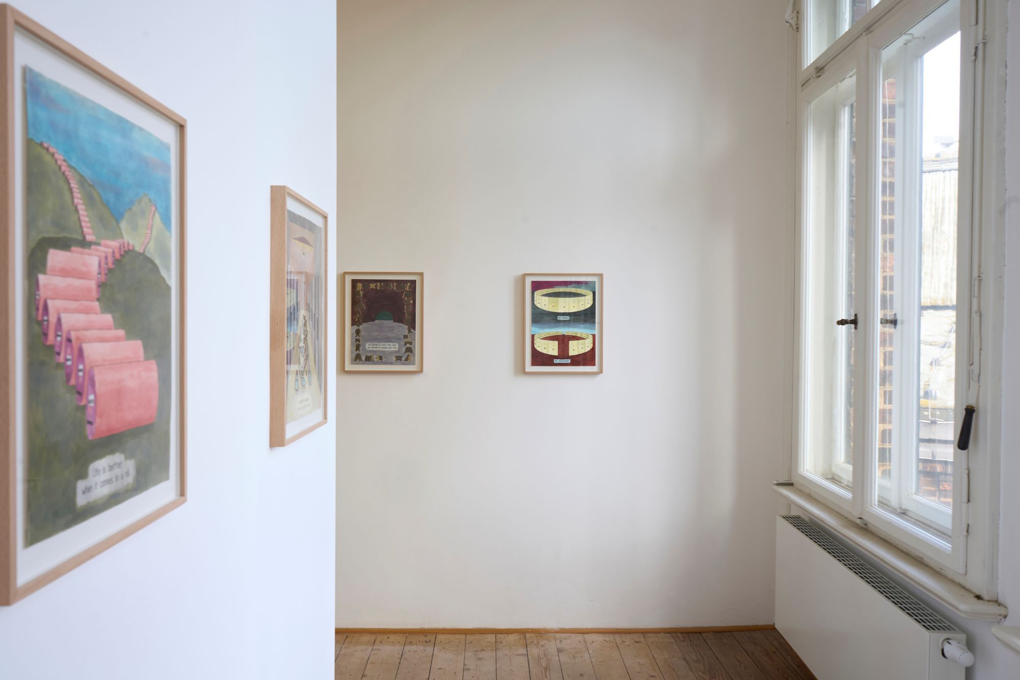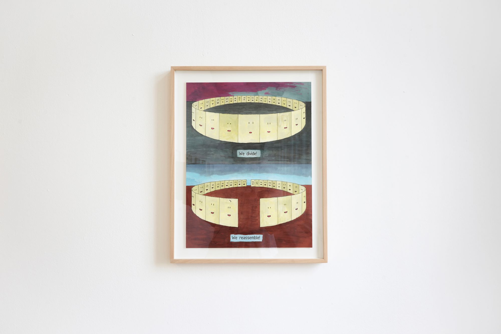 Scriber Stories is a series of works in watercolor and ink on paper that explores themes related to pictorial representation, irrationality, and self-exploration. Inspired by a classic one-panel comic format, the series combines text and image in a consistent size ratio. Rather than relying on traditional representational imagery, the works seek to present a character-driven, non-representational world. Here, the characters' exploration of their own design forms the basis of the narrative, as the self-aware figures reflect on their existence, navigating both childlike curiosity and fear.