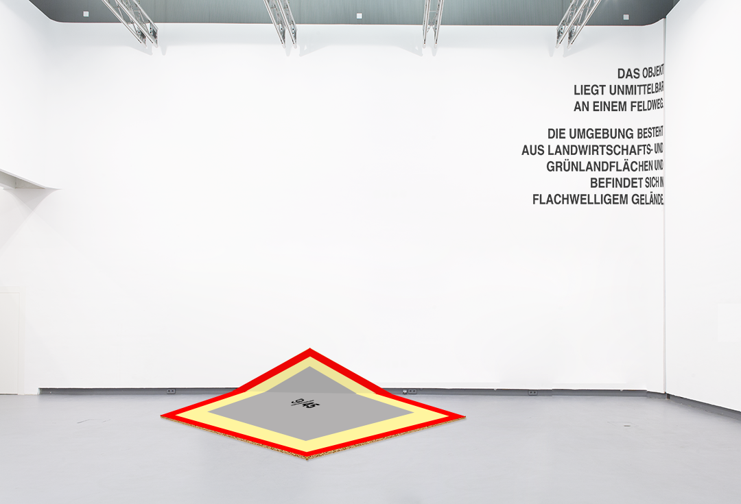 Neben den eingebauten Flurkarten sind Textfragmente angebracht, die aus der Beschreibung der Auktion zu den jeweiligen Objekten entnommen sind und als Anlage zum Kaufvertrag angefügt wurden. Sie dokumentieren einen vermeintlich „objektiven“ Zustand der tatsächlichen Orte und ihrer Umgebung und stellen eine Verbindung zum Aussenraum her. Durch die Größe und Positionierung der Schrift sollen auch die Texte als eigenständige Objekte wahrgenommen werden und eine Verbindung zur Architektur der Galerie aufbauen.