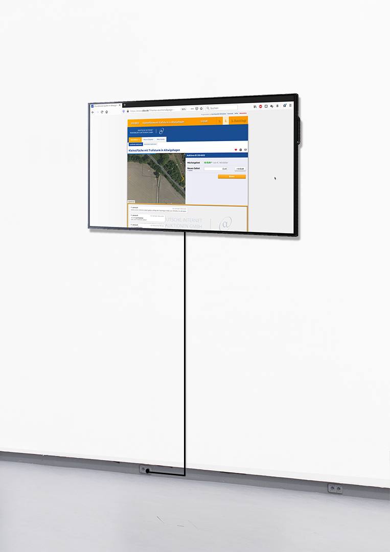 Eingeleitet wird die Ausstellung durch eine Serie von gedruckten und gerahmten Orthofotos mit eingezeichneten Liegenschaftskarten, auf denen farbig hervorgehobene geometrische Formen Grundstücke markieren, die in mein Rechercheraster passen und für die ich einen Bietantrag gestellt habe. Die Recherche und Suche nach Grundstücken ist stark abhängig vom Angebot und es zeigt sich, dass meine künstlerische Auseinandersetzung mit Grundeigentum eng an die Dynamiken und Verhältnisse eines Marktes geknüpft ist. Zum anderen bringt das auf die Fotografien eingezeichnete Netz der Liegenschaftskarten die sonst vielerorts auch unsichtbaren Grenzen in unserer Umwelt zum Vorschein.