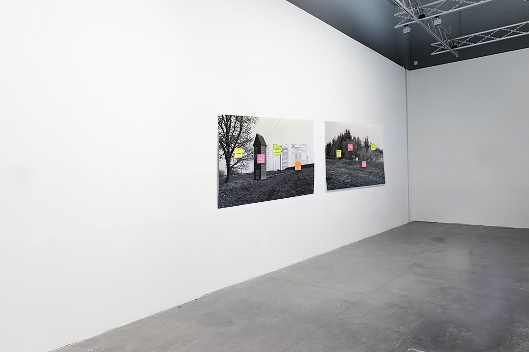 Auf der Empore der Galerie ist neben dem Auslaufen des Flurstücks 3/175 und dem Wandtext eine letzte Arbeit installiert. Zu sehen sind dort zwei ungerahmte und mit Dokumenten bedruckte Landschaftsfotografien in schwarz/weiß. Auf den Fotografien kleben farbige Post-its, die ebenfalls überdruckt sind. Die Fotografien dokumentieren die gekauften Grundstücke und ihre Umgebung. Sie stehen in der Tradition klassischer Landschaftsfotografie, nehmen durch ihre monochrome Oberfläche Bezug auf ein anachronistisches Verständnis von Objektivität und werden dadurch selbst zum Dokument. Die darauf gedruckte und nur teils lesbaren Textdokumente sind Auszüge aus den jeweiligen Grundbücher. Die Einsicht in diese exklusiven Archivgüter ist nur wenigen Vorbehalten, unter anderem den Eigentümern. Sie verifizieren territoriale Machtverhältnisse und speichern im Stillen alle ihnen zugehörigen Prozesse und Veränderungen. Durch die mit den Grundbuchauszügen bedruckten Fotografien und dem assemblageähnlichen Anbringen der Haftnotizen möchte ich den Gestus und die Ästhetik der Recherche betonen und die unsichtbare Tiefe der individuellen Geschichte und Organisation jedes noch so kleinen Territoriums zum Vorschein bringen.