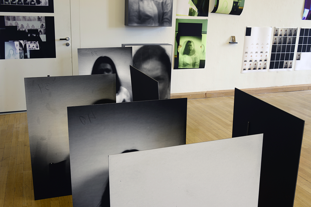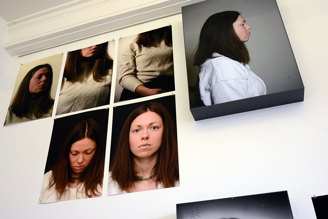 In der praktischen Arbeit meines Diploms entschied ich mich deshalb für das Medium der Fotografie. Denn die Fotografie, als methodisch-prozesshafte Bild und Erinnerungstechnik verstanden, gibt mir unbegrenzte Möglichkeiten, mich selbst zu spiegeln. Über einen Zeitraum von ca. 3 Monaten konstruierte ich von mir eine Fülle von Portraitserien: Momentaufnahmen, »Erinnerungsstücke«, Deutungsversuche;… – und ordnete diese in einem zweiten Prozess in Form einer Mindmap an: Um so auch wechselseitige Beziehungen und Assoziationen zwischen den ausgewählten Portraits und Serien stärker herausstellen zu können. Ich druckte diese Bilder in unterschiedlichen Größen aus, platziere sie seriell und als Cluster an der Wand, sowie im Raum. Durch die räumlichen Anordnungen werden für mich die Bezüge zwischen den Fotografien sichtbarer, sie erhalten nun zusätzliche Ebenen, und können so aus unterschiedlichen Blickwinkeln betrachten werden.