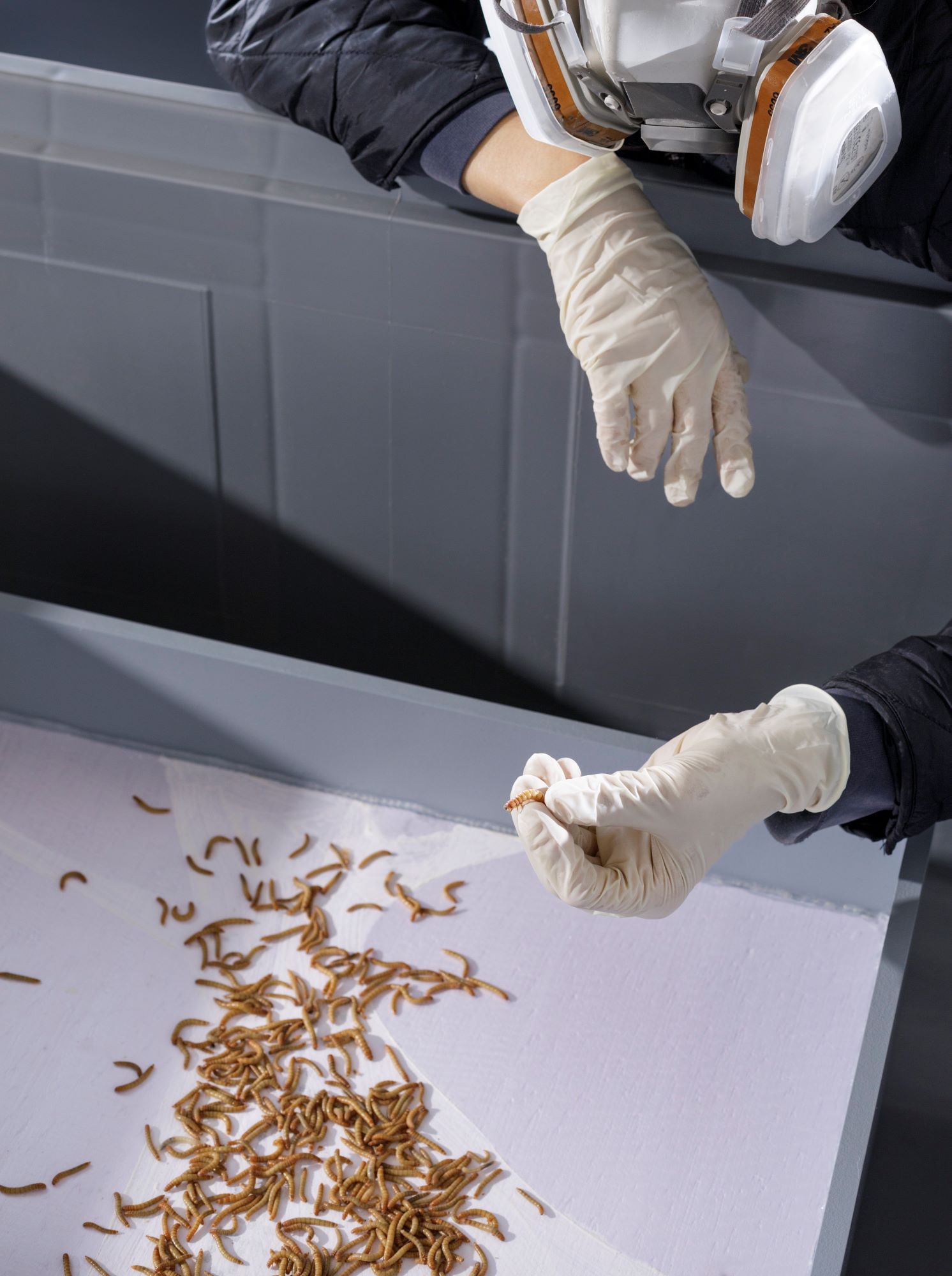 The byproduct of this process, mealworm frass, is integrated into the construction material GEOBRIS, developed by Zschiedrich, redefining the potential of recycling. HYBRIS highlights the often underestimated role of the smallest creatures in our ecological system, turning them into central players in a dynamic, regenerative process.