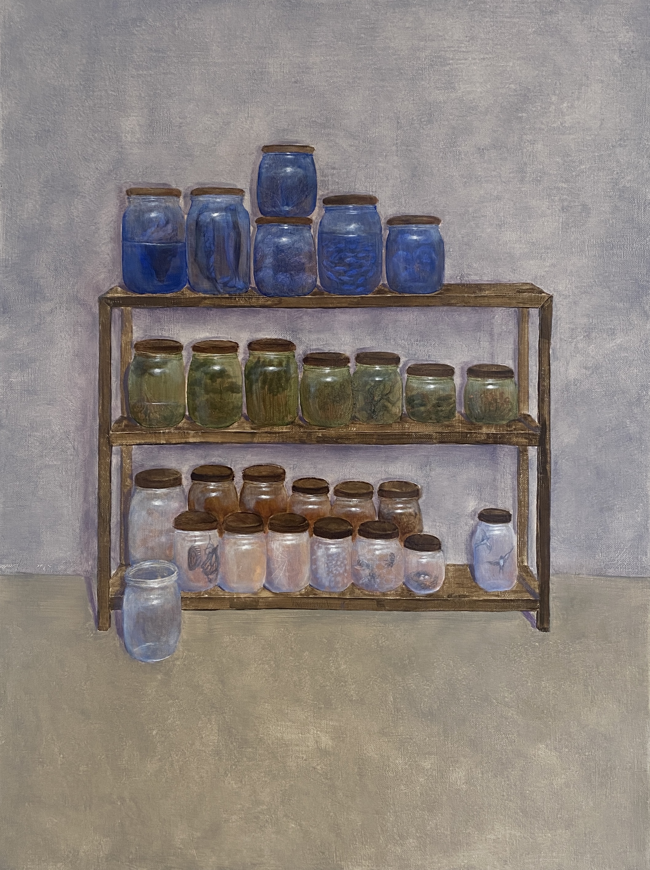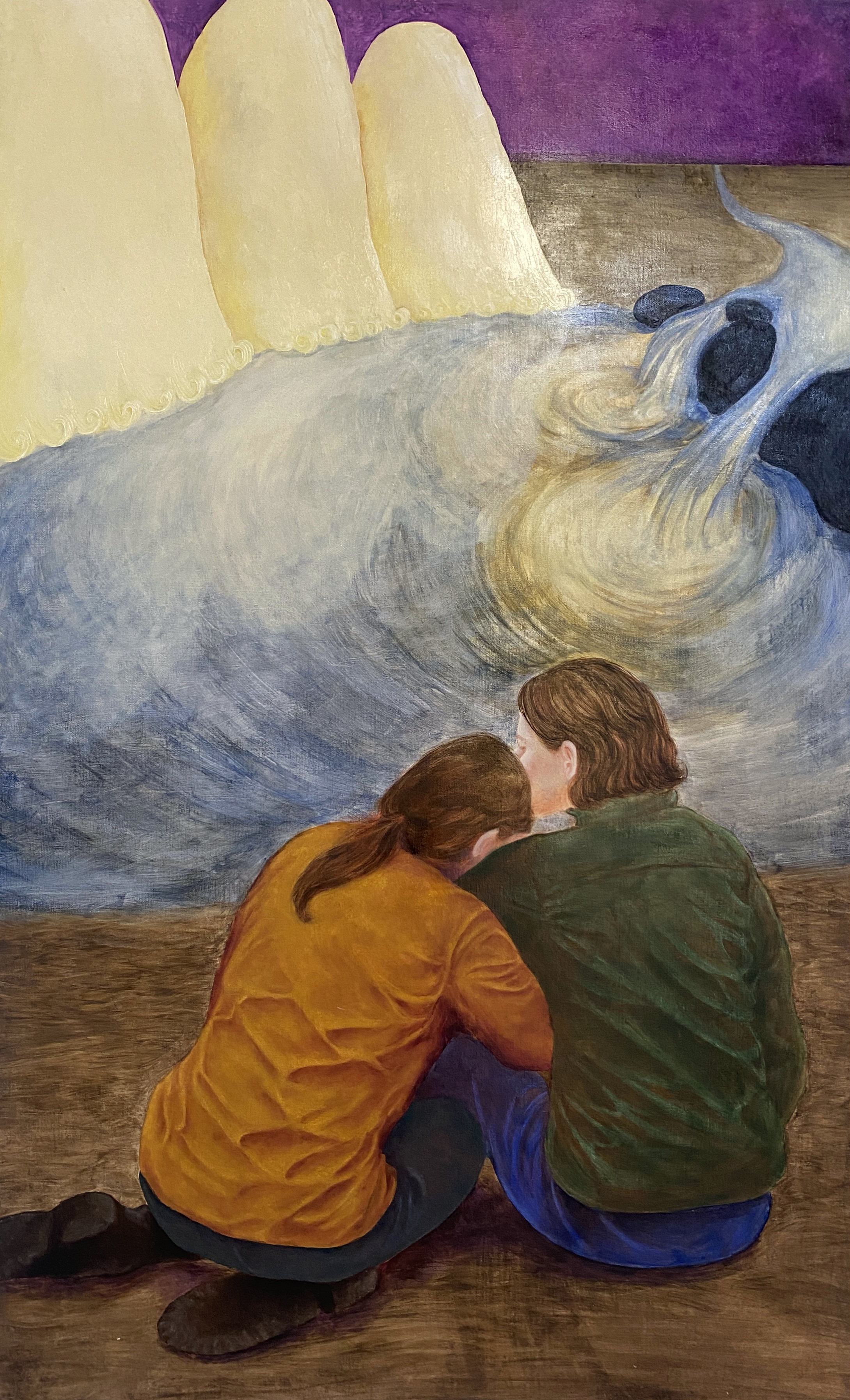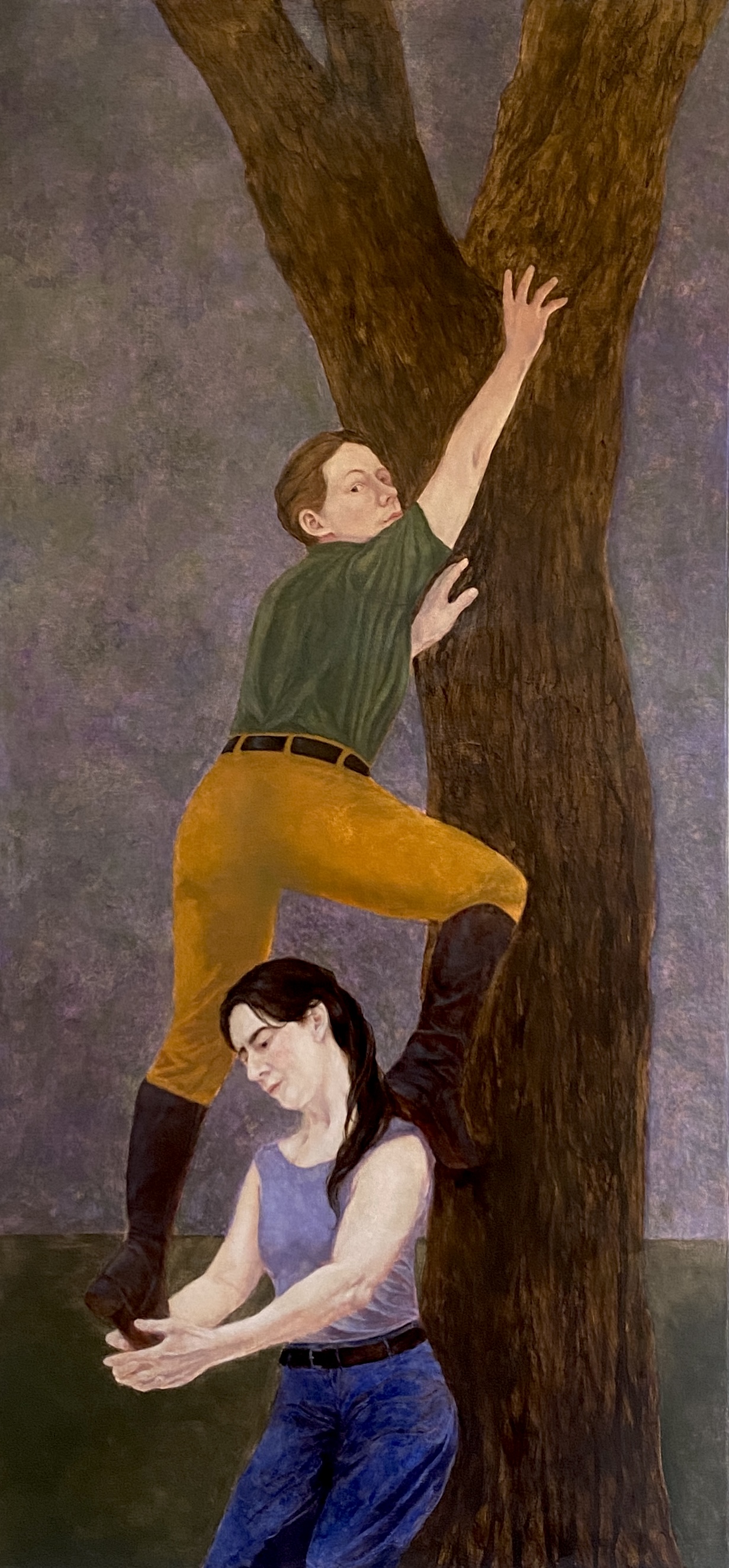 Thematically, I engage with the relationship between humans and nature—its historical ruptures, current crises, and possible future developments. Dystopian scenes emerge in barren landscapes, imbued with a latent sense of threat. Against this global environmental dystopia, I set interpersonal utopias—shaped by sisterhood, solidarity, and empathy. Through physical gestures such as piggyback riding or human ladders, images arise that depict social bonds: fragile yet resilient networks of mutual support. Small-scale still lifes with references to reproduction and preservation modularly complement my pictorial cosmos.