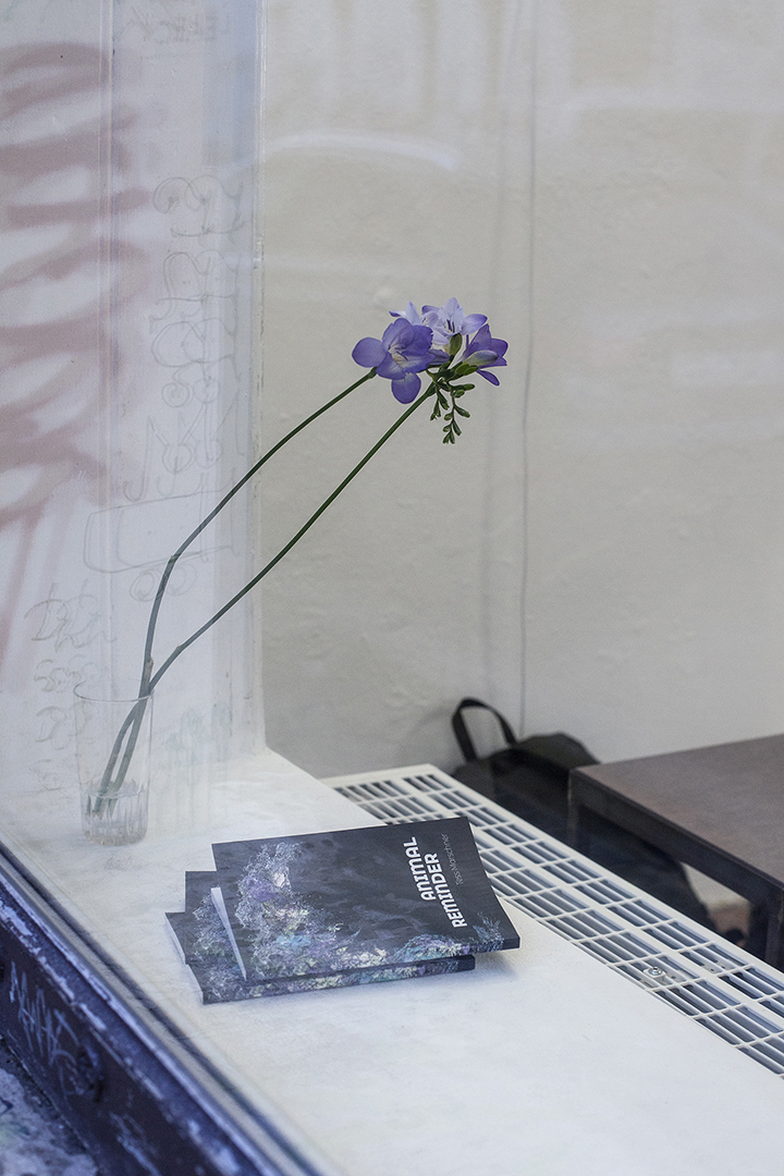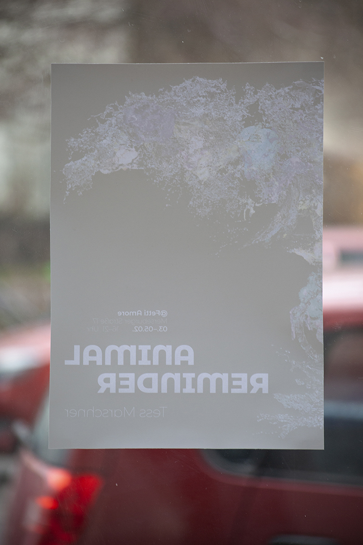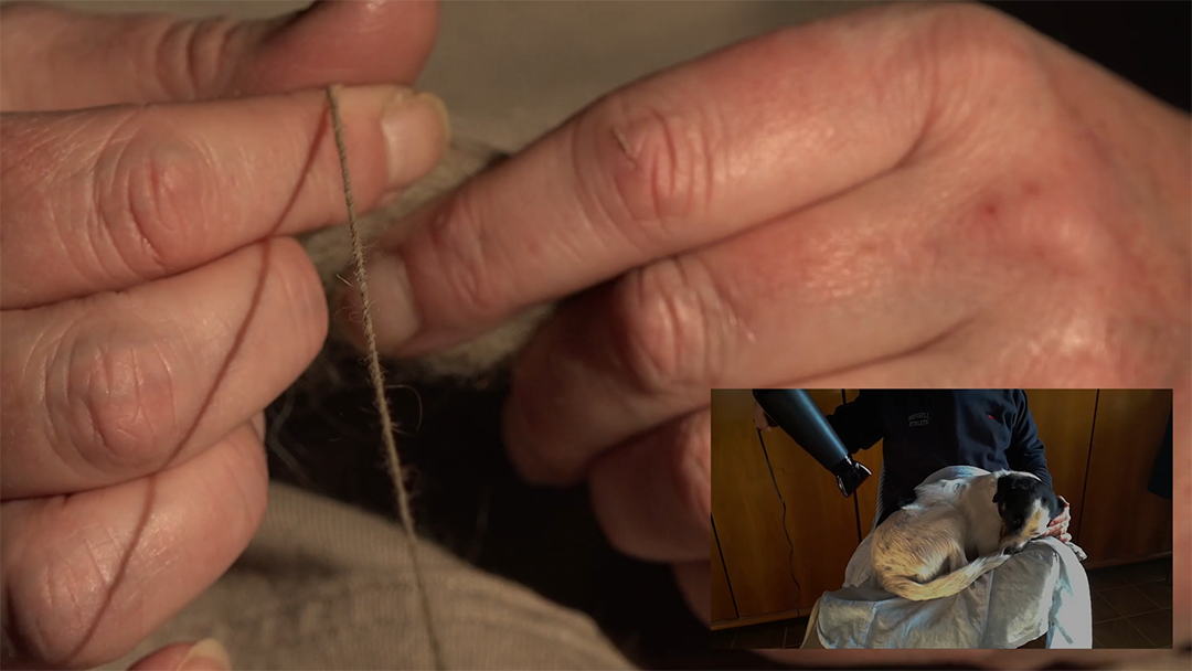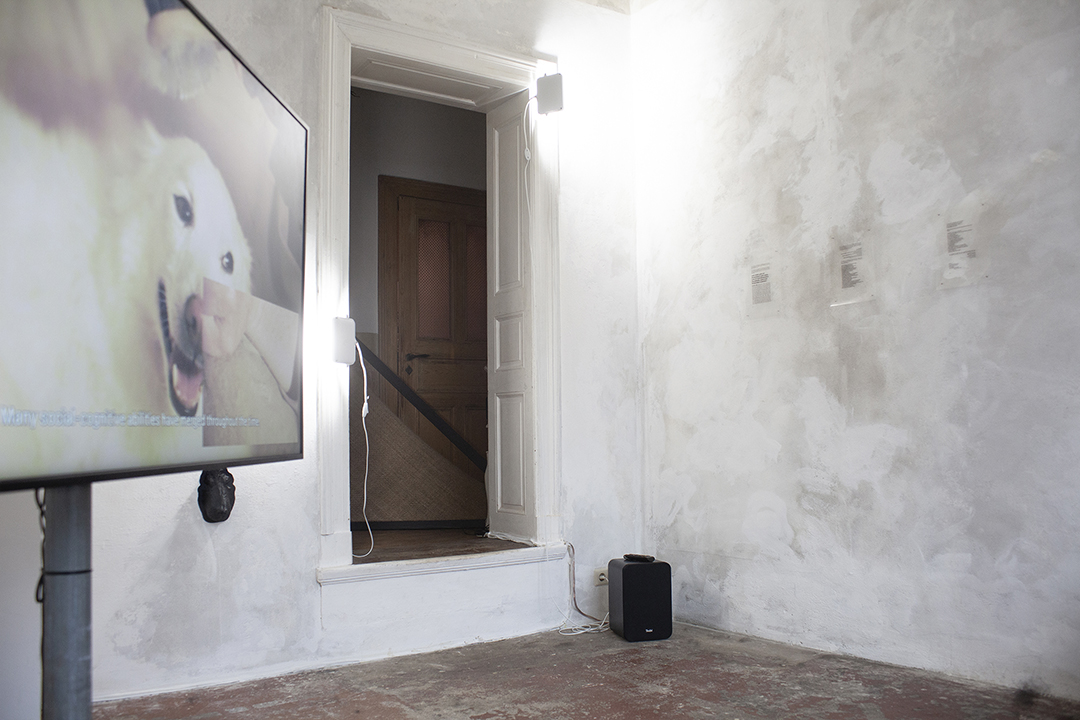 Das Video FIBERS AND FURS verknüpft Geschichten über die Domestizierung des Haushundes und des Webens, welche als feministische, kommunikative Praktiken die Bedingungen menschlicher Kultur maßgeblich prägen. Die anderen Objekte im Raum - Artefakte der Teilhabe und Tier*haltung - stehen im Dialog mit den Fäden und Fellen des Videos. Die Theoriearbeit ANIMAL REMINDER übt das Denken im Verwandtschaftsverhältnis im Forschungsfeld der Human-Animal-Studies.